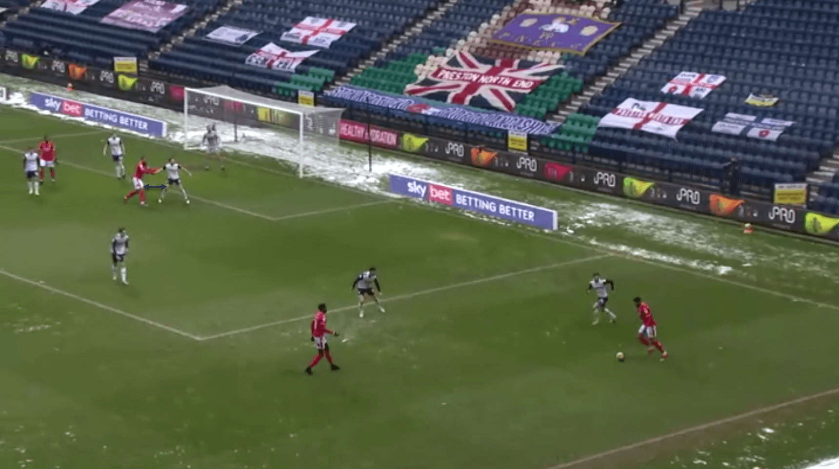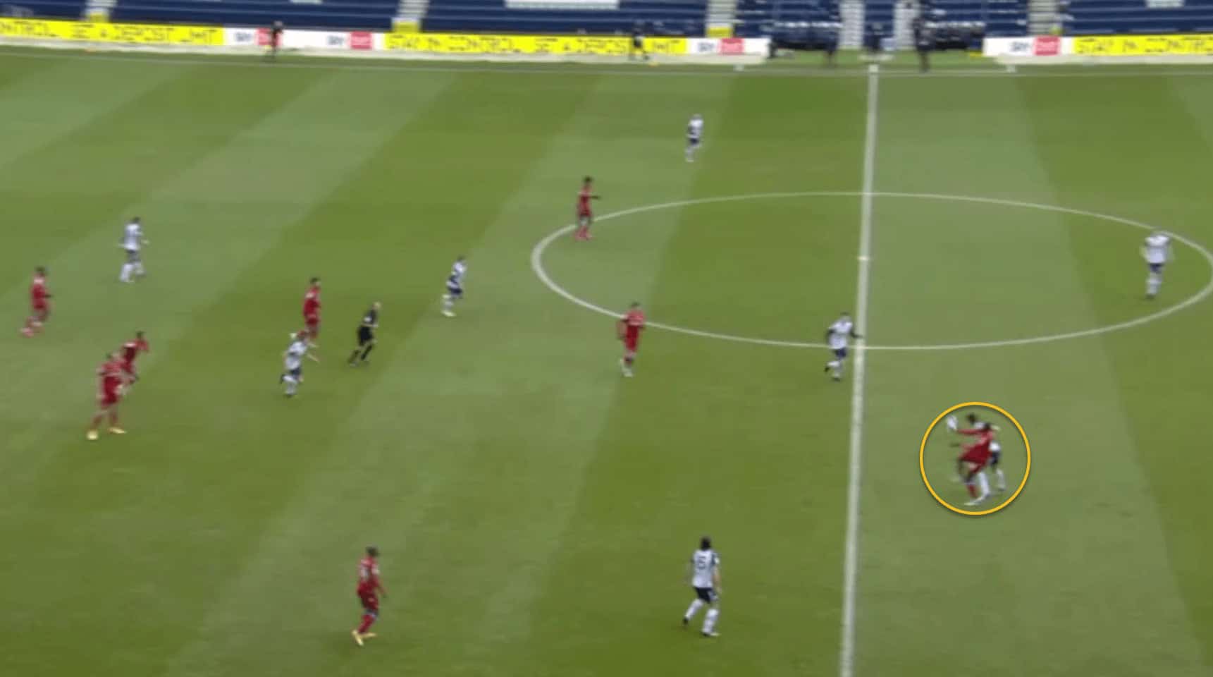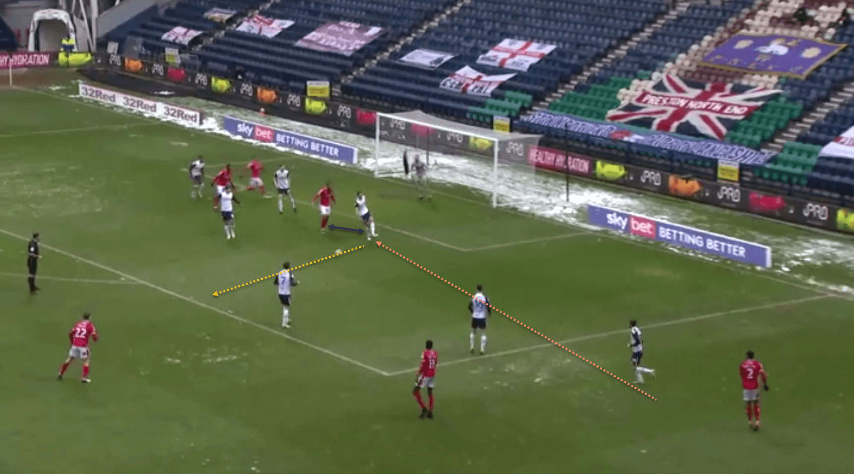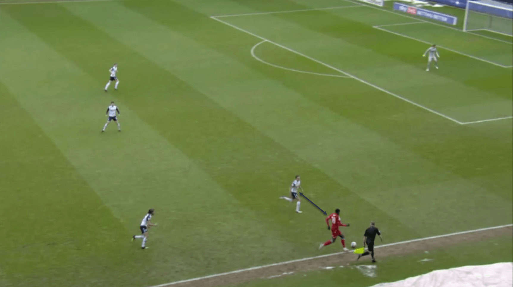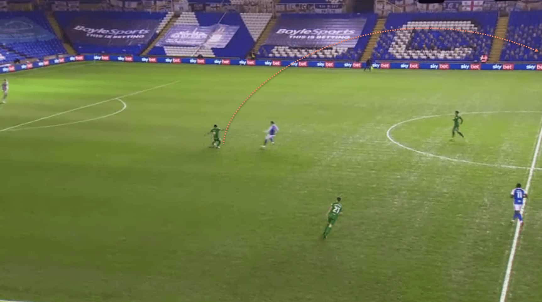 …where his teammate is able to receive the ball in space. Also note how the opposition left-back, in sprinting out to cover the space, is leaving a huge gap in behind for the Preston midfielder to run into, which could be exploited if the right pass is made.