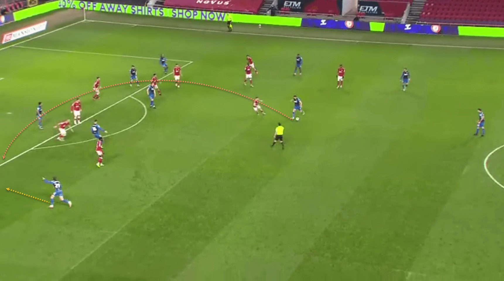 Here is one example of such a switch of play – Davies is able to move up to near the halfway line on the ball, and then spots an opportunity to switch the ball out the right…