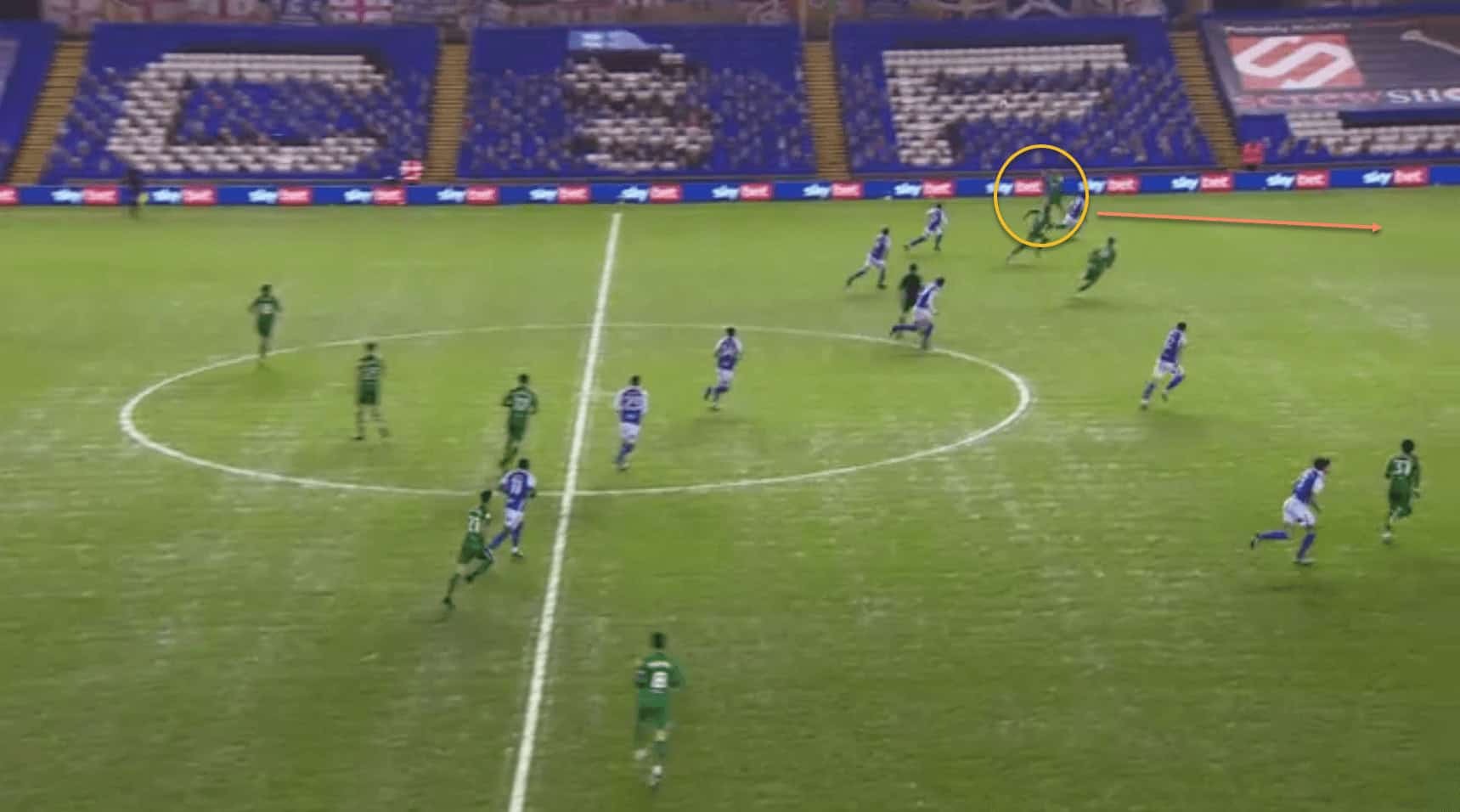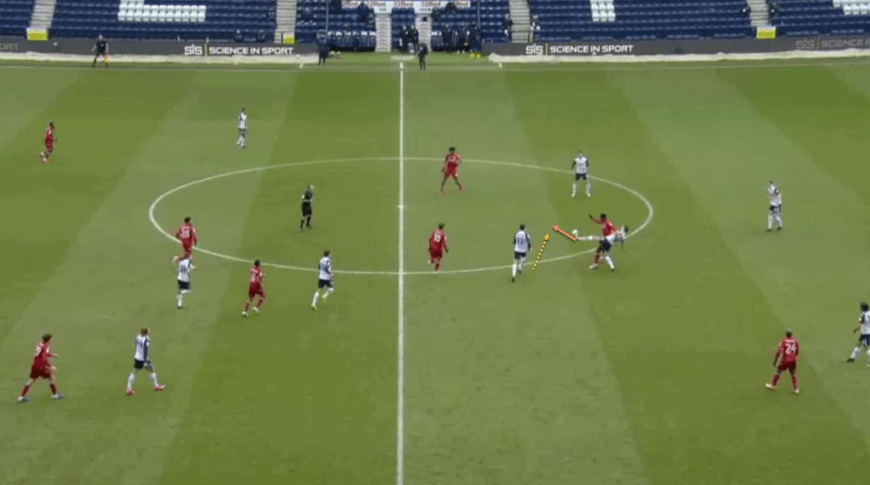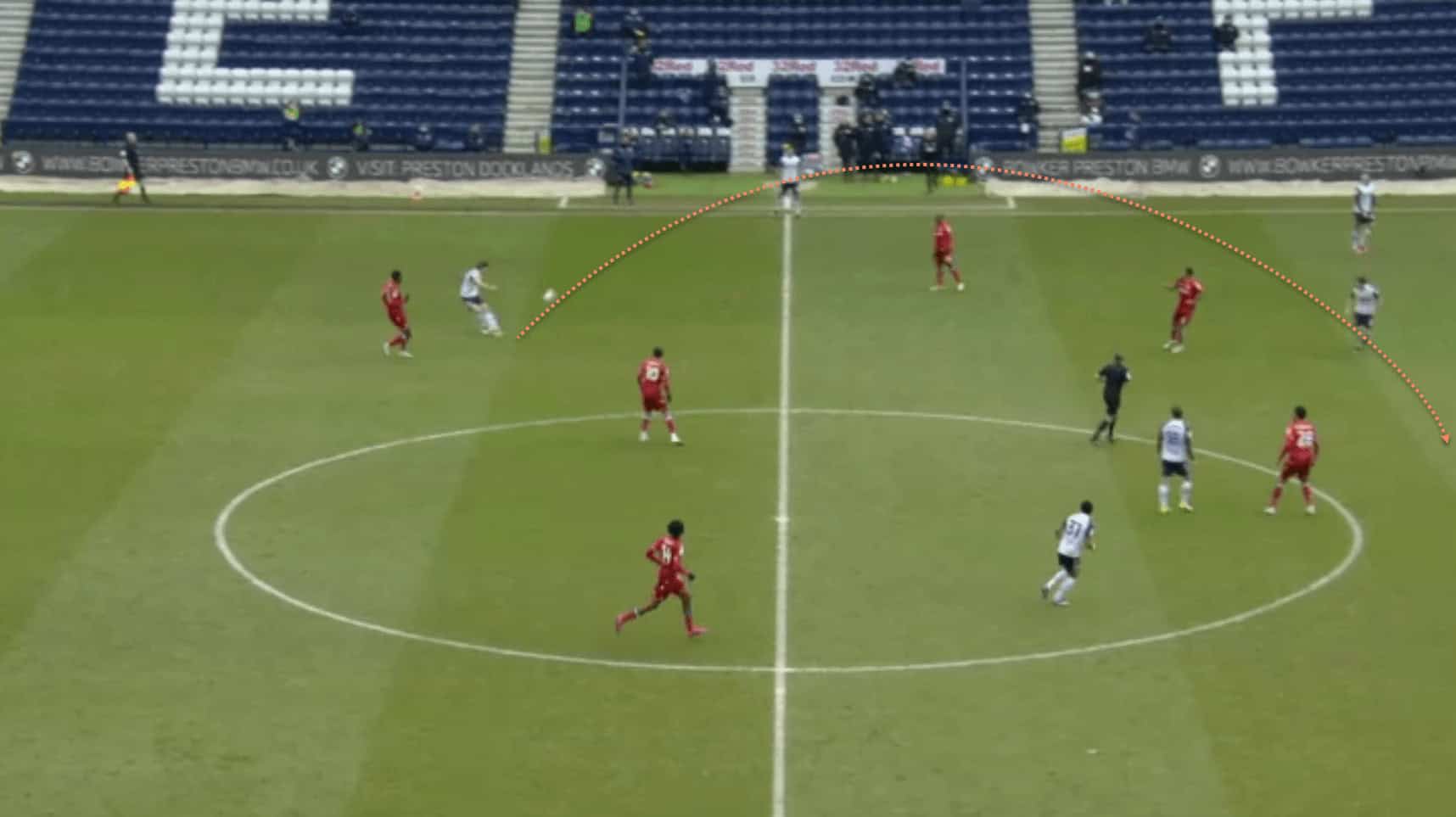 Davies is in a deeper position in his half, but has just received the ball after a Preston attacking move broke down. He chooses to pass out wide here rather than play a safe pass…