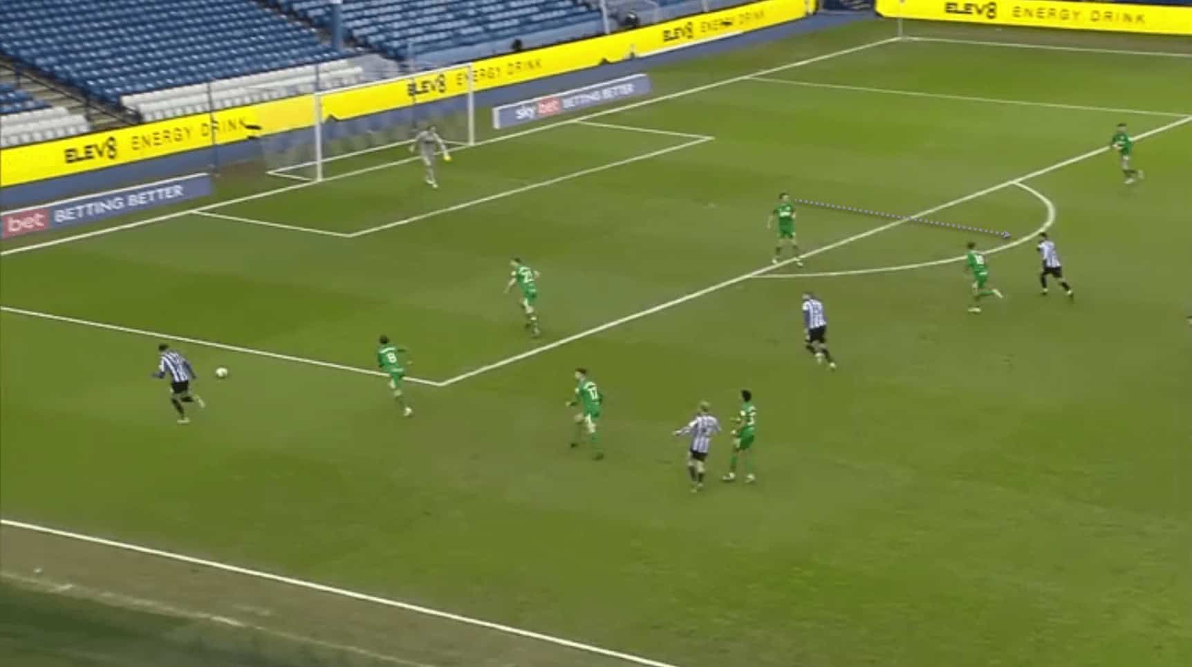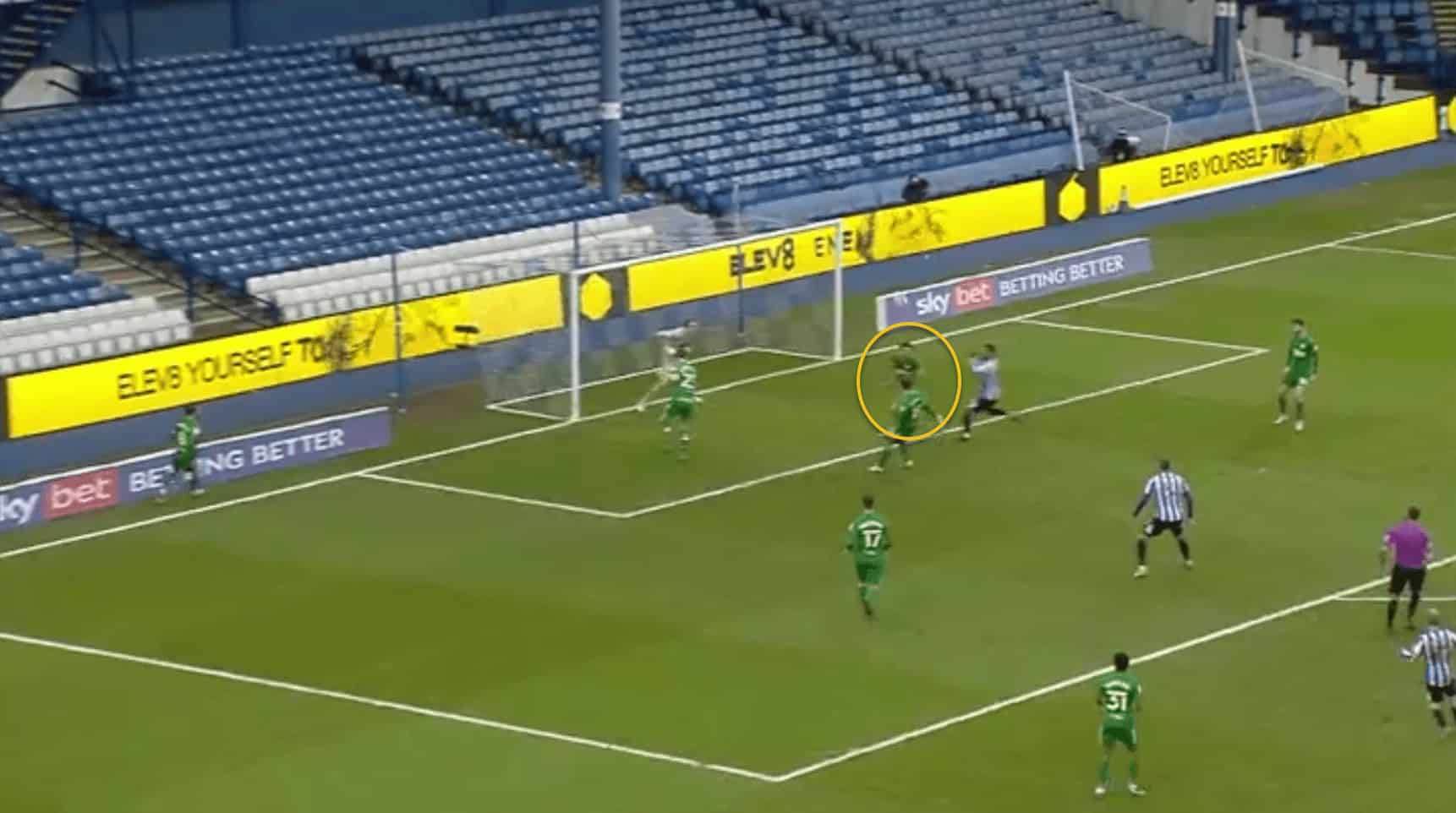 Note here, that when the ball is played out wide, Davies takes a look to assess the position of the Sheffield Wednesday attacker who is beginning to run into the box.