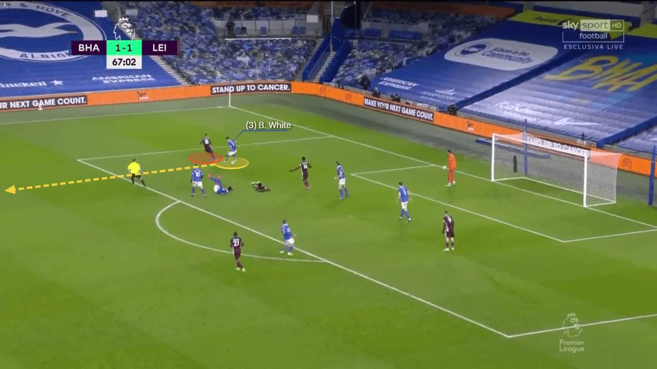 White’s awareness and understanding of the game are crucial defensively too. While he is more efficient thanks to his positioning and anticipation skills, rather than his physical duels. His ability to cover depth, especially whenever the full-back/wing-back has failed to drop back in a timely manner is very important. His tendency to close out space is beneficial against teams that tend to play with width and rely on crossing.