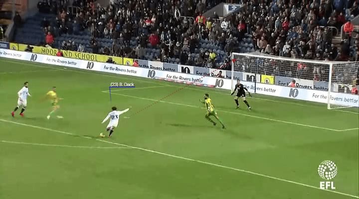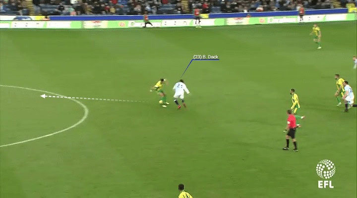 The best way to describe Dack is that of a “shadow striker,” in a way similar to Dele Alli. With the majority of Dack’s goals being from the old cliche of being in the right place, at the right time. But this is no fluke or luck, his intelligence off-the-ball allows him to make simple tap-ins. Dack’s tactical intelligence is shown in the image above, Norwich happen to be playing an incredibly high-line. Dack understands in order to beat this system, he needs to make long runs from deep – something he does to an incredibly high standard. It is, in fact, his ability to make runs and remain unmarked that allows him to be such an important player for Blackburn, as many teams play an attacking system with a high defensive line against them