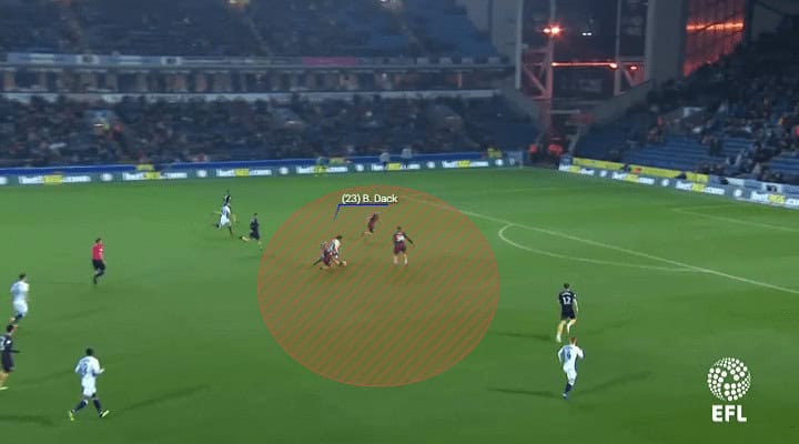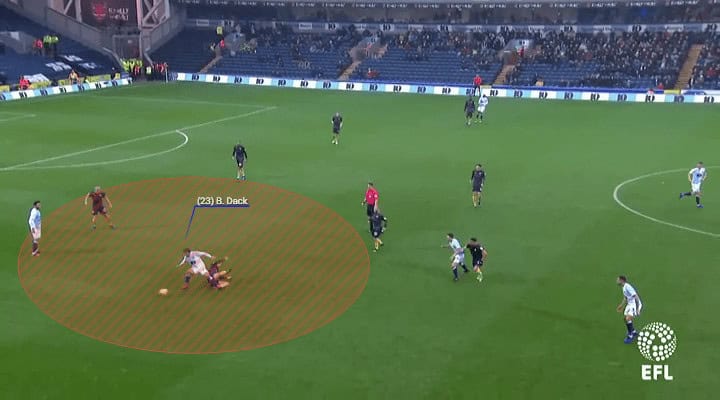 In the image above, we see Dack being aggressively pressed. Dack manages to keep perfect control of the ball, and in doing this, he moved his marker to the byline of the pitch. In doing this, we see an abundance of dangerous space opened up, this space is marked red. The red space is completely open and is an important zone as it is in the centre of the pitch, and therefore the most dangerous. This zone was exploited, the zone was taken up by a Blackburn centre midfielder and allowed them to numerically dominate the centre of the park.