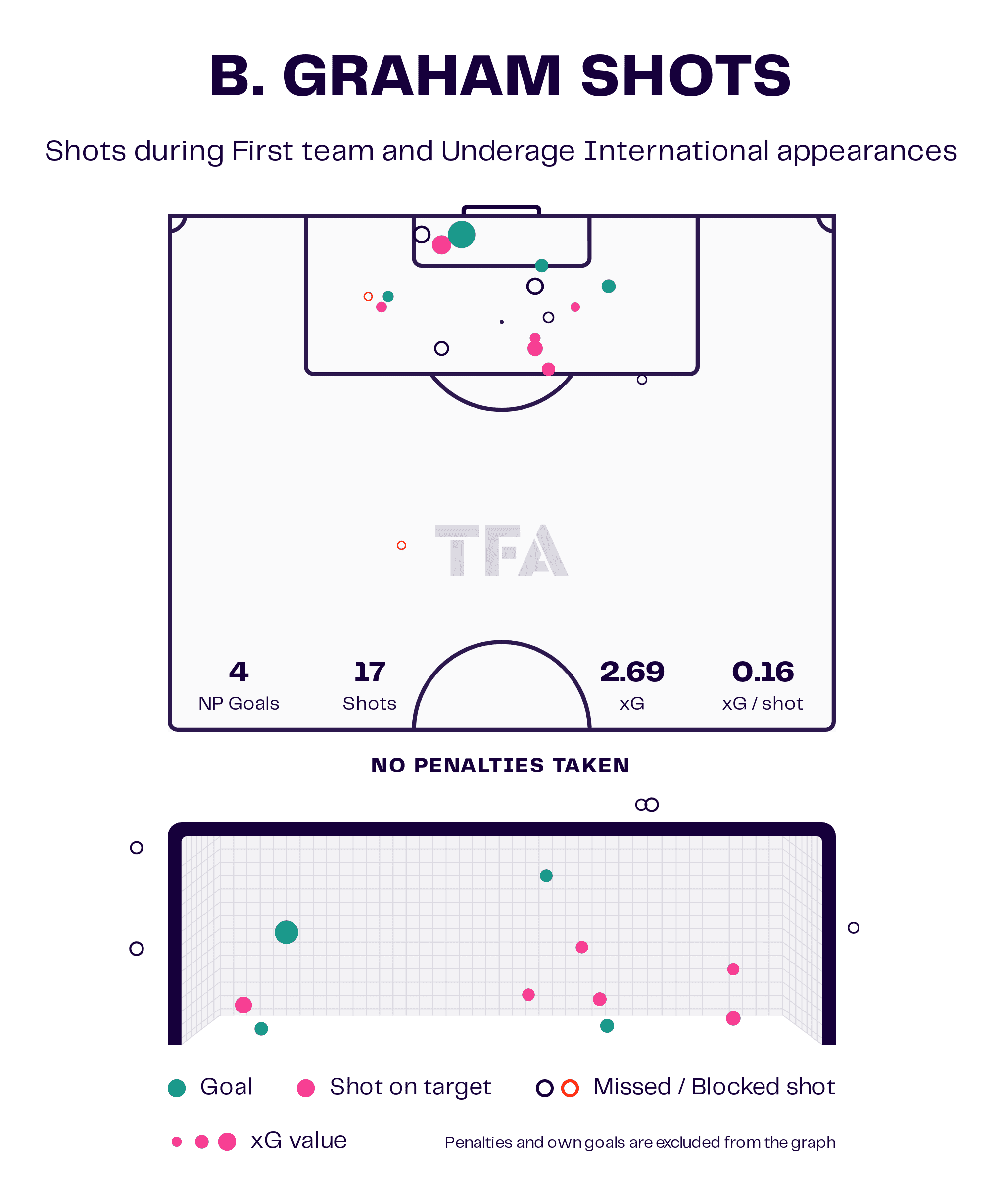 Data from his first-team appearances and national team appearances at u17, u18, and u19 show that he is poor when contesting for the ball in the air. Graham has only won 21.9% of his headers.