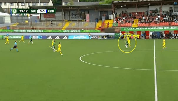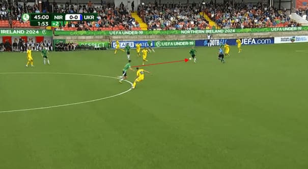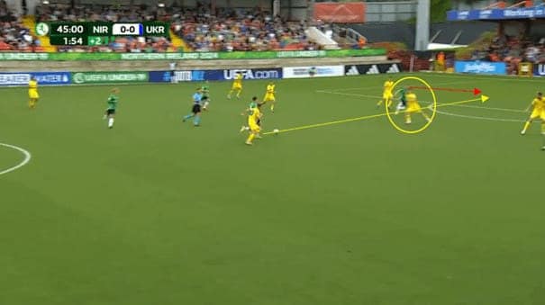 In this situation, a ball breaks loose and Northern Ireland are quick to pounce on the ball.