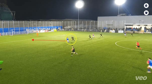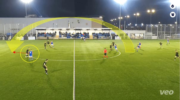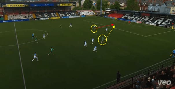 This creates the space behind the opposition’s defence, allowing Graham to slip in his teammate, who is advancing.