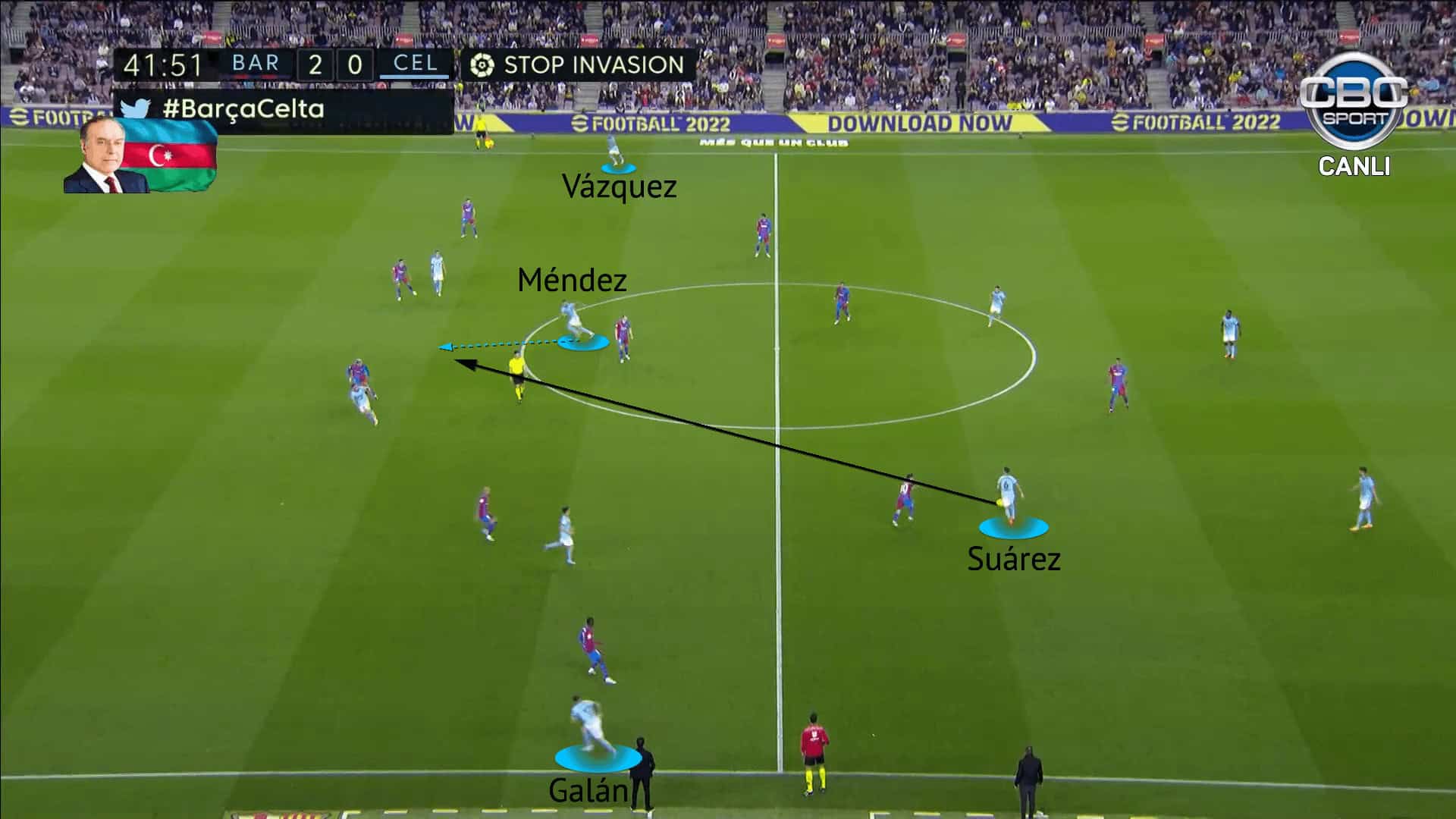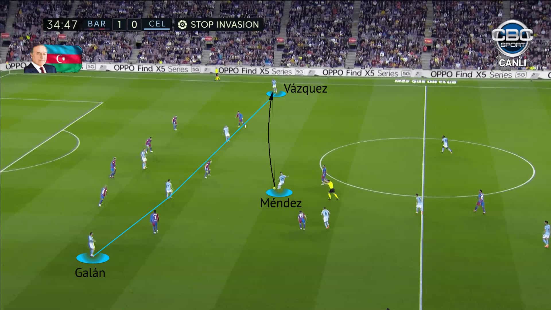 As we mentioned earlier, Méndez’s role throughout his Celta career was very fluid, given the freedom to roam and perturb an opposition’s defensive shape. As a result, the Spanish international would regularly occupy spaces between the lines. An example of this can be seen above, with Méndez ghosting off the back of Barcelona midfielder Frenkie de Jong to receive an exceptional line-breaking pass from Denis Suárez.