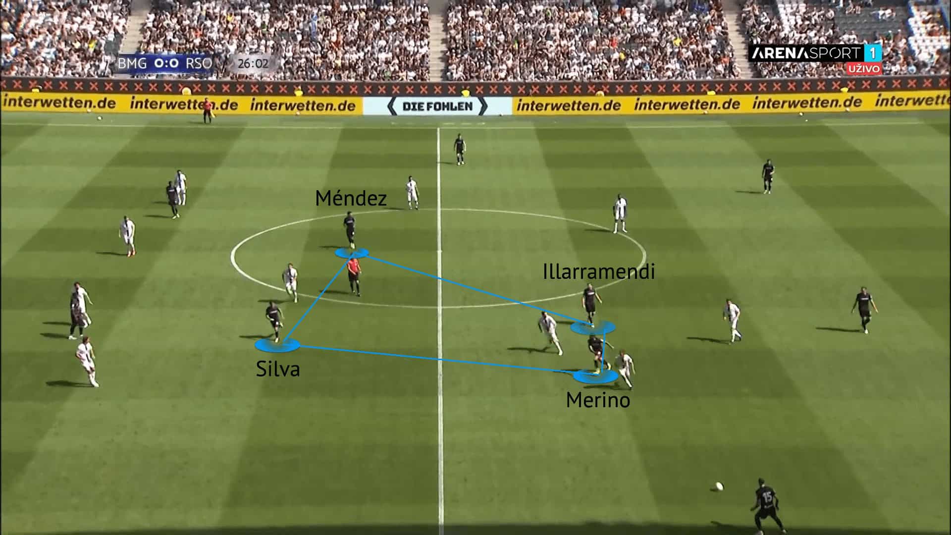 The image below is an example of Méndez, deployed as the right-sided central midfielder in La Real’s diamond midfield, dropping from between the Borussia Mönchengladbach defensive and midfield line to receive off centre-back Robin Le Normand and find pivot player Asier Illarramendi.