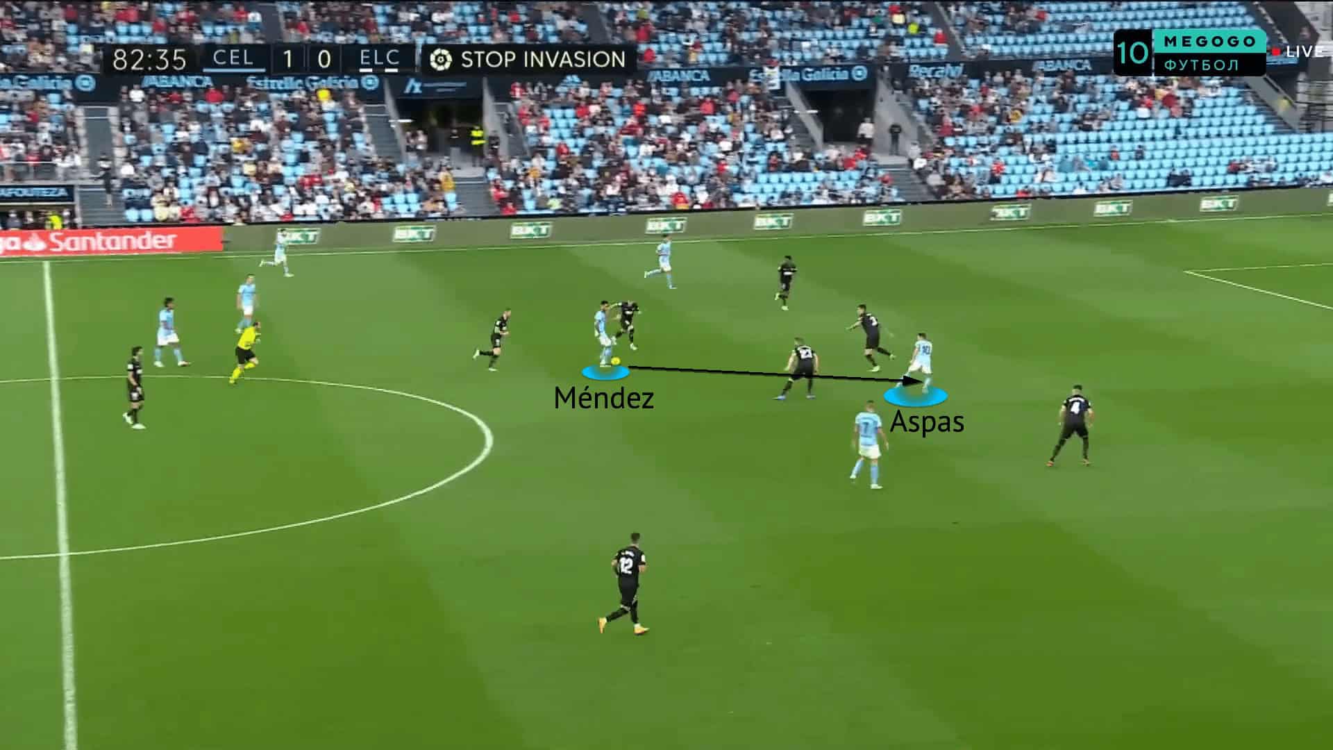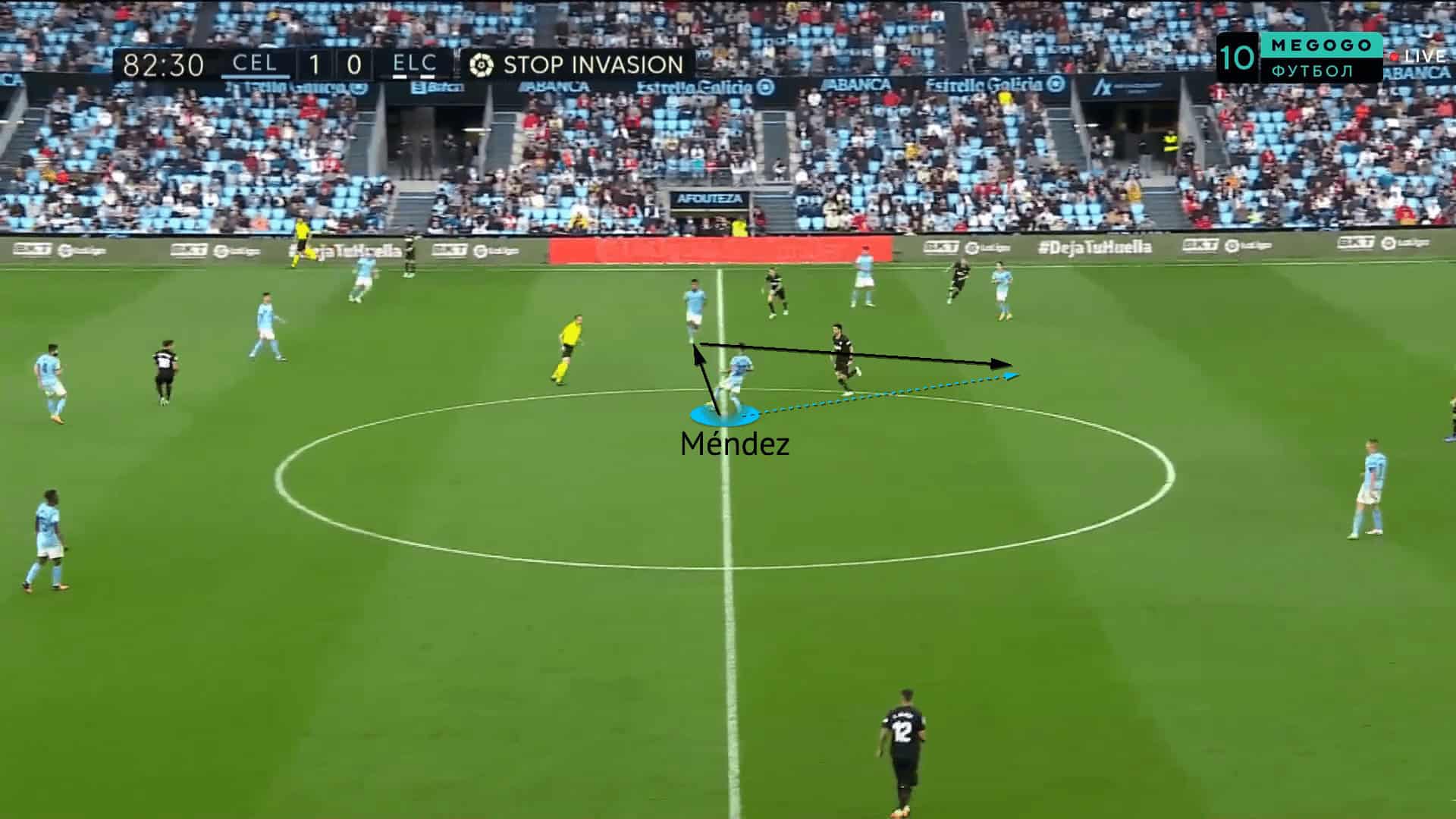 The figure above displays Méndez collecting a loose ball in the midfield and playing a one-two with Renato Tapia. Ghosting past Elche midfielder Javier Pastore with the fluid one-two passing game that’s regularly seen at Real Sociedad to get between the lines, Méndez threaded a defence-splitting pass into Iago Aspas. The former Liverpool striker’s shot was saved after the nicely weighted pass.