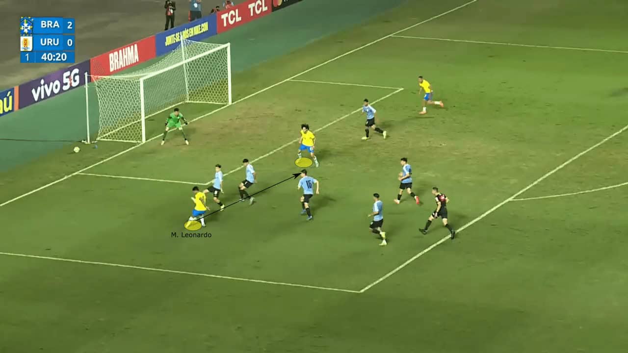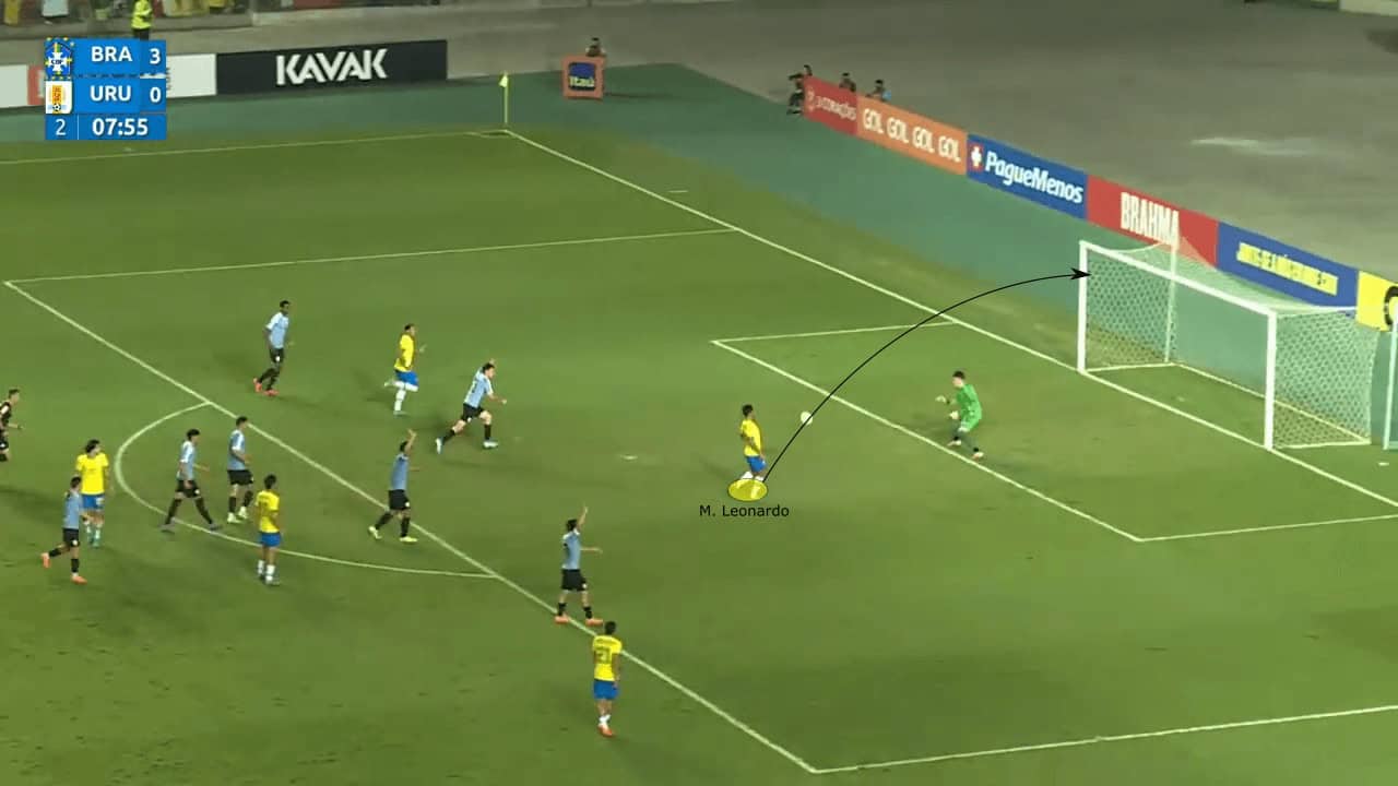 In Brazil’s sixth goal, we are able to see Marcos Leonardo’s technical ability through his first touch yet again.