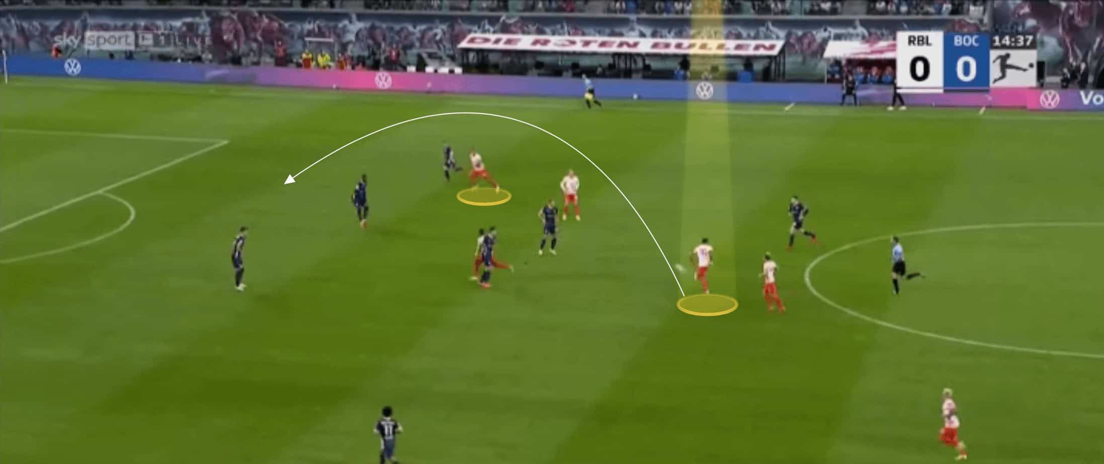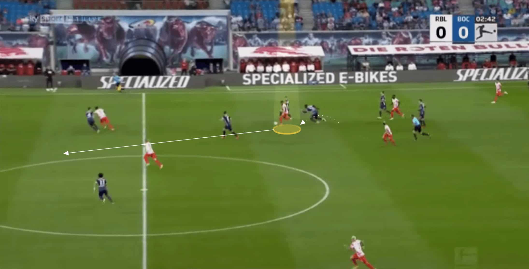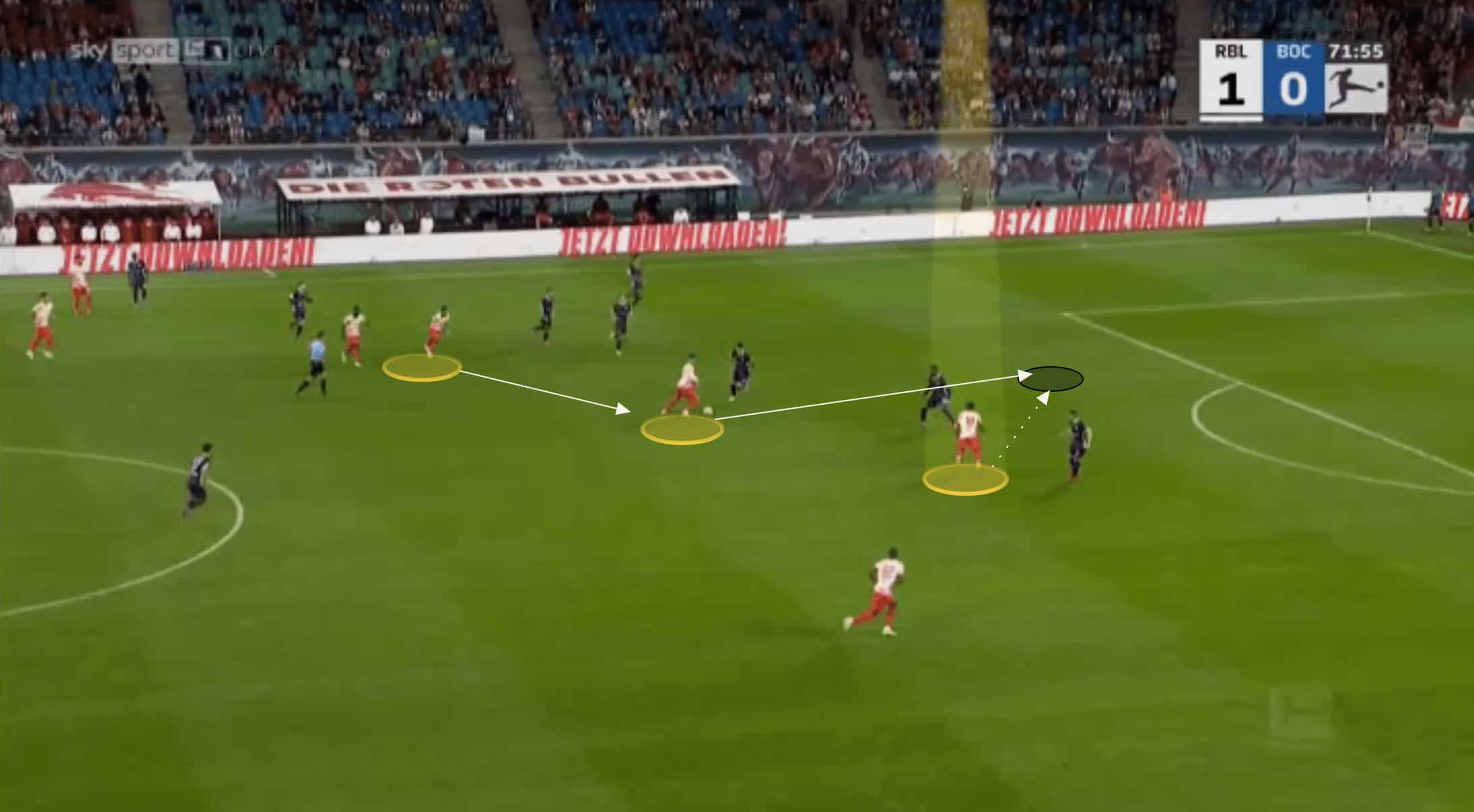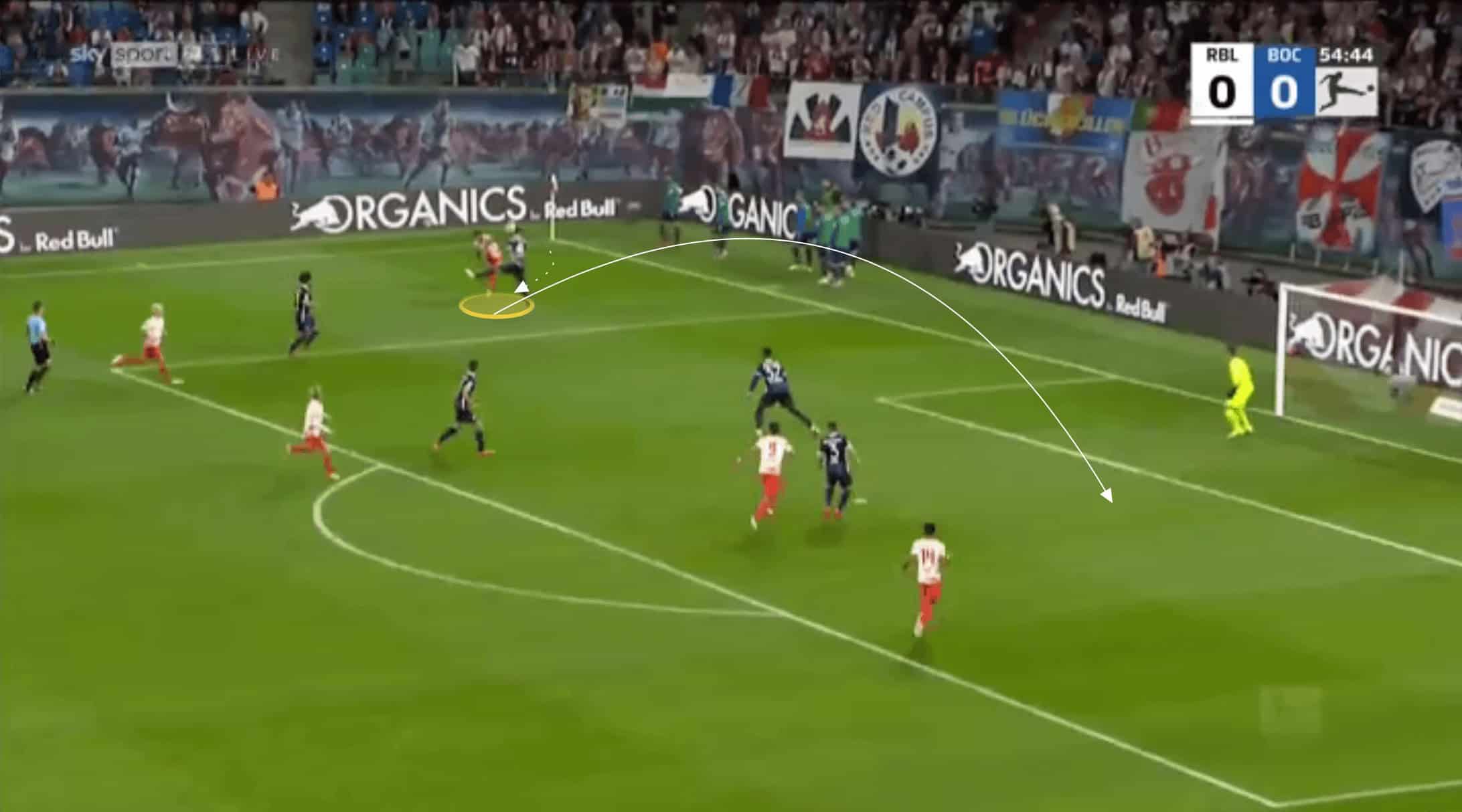 Nkunku shows a variety with his passing too. He shows innovation and ingenuity to disguise his passes and whilst he doesn’t always look to hit difficult passes, valuing retaining possession too, he can play passes few midfielders can pull off. Below is a perfect example of this against Bochum, where he disguises the forward pass shown, hitting a no-look lofted pass over the top for his teammate to run onto.