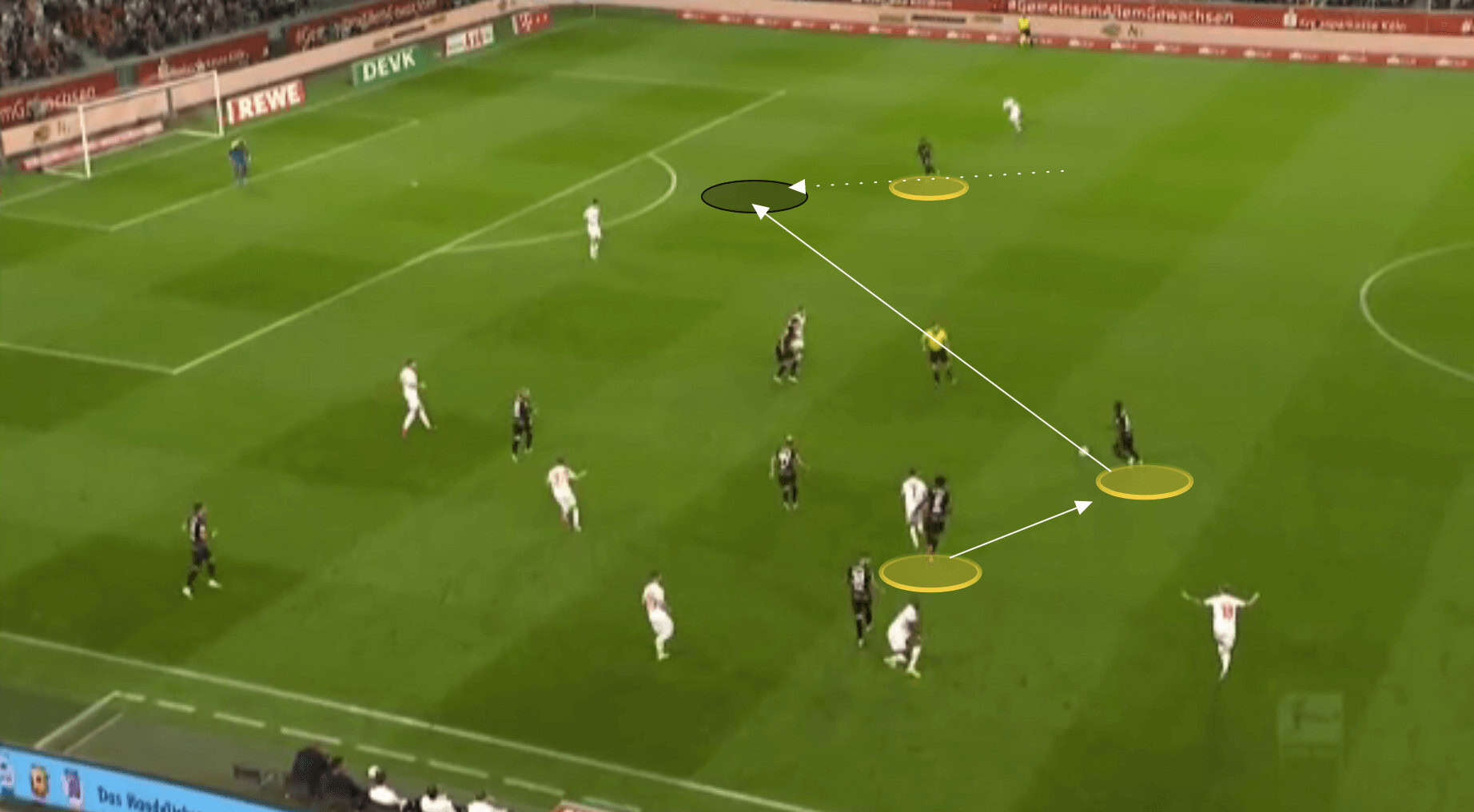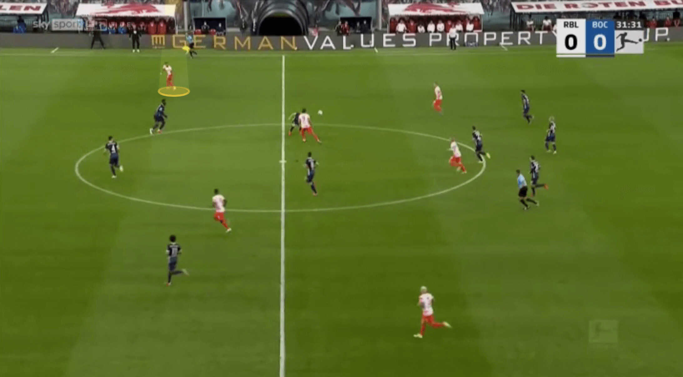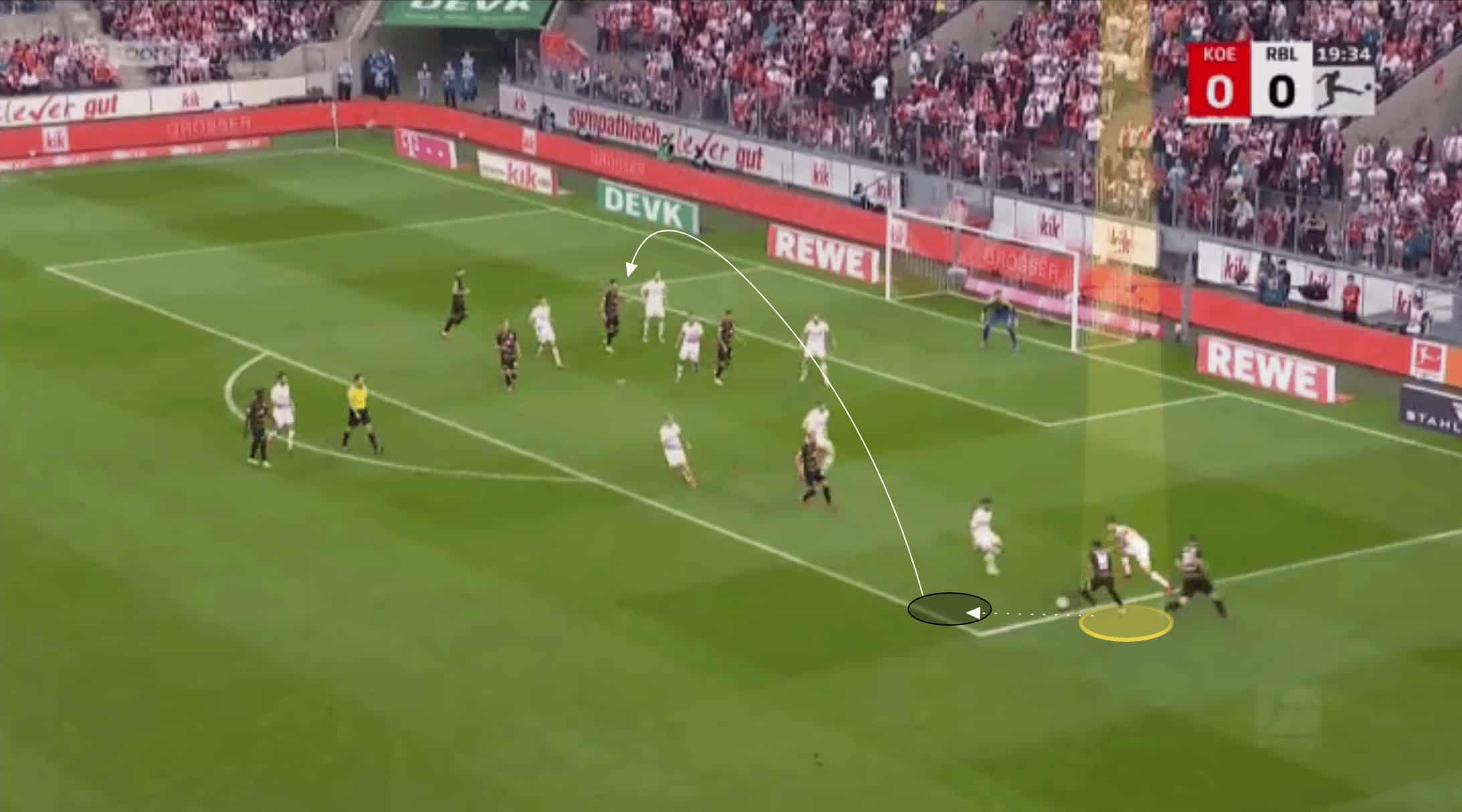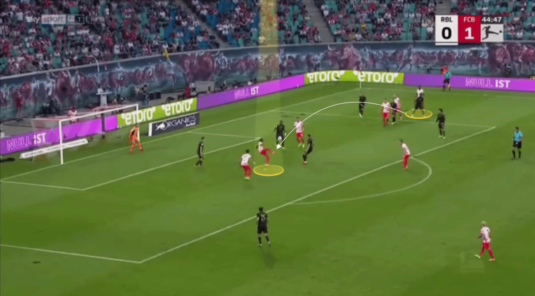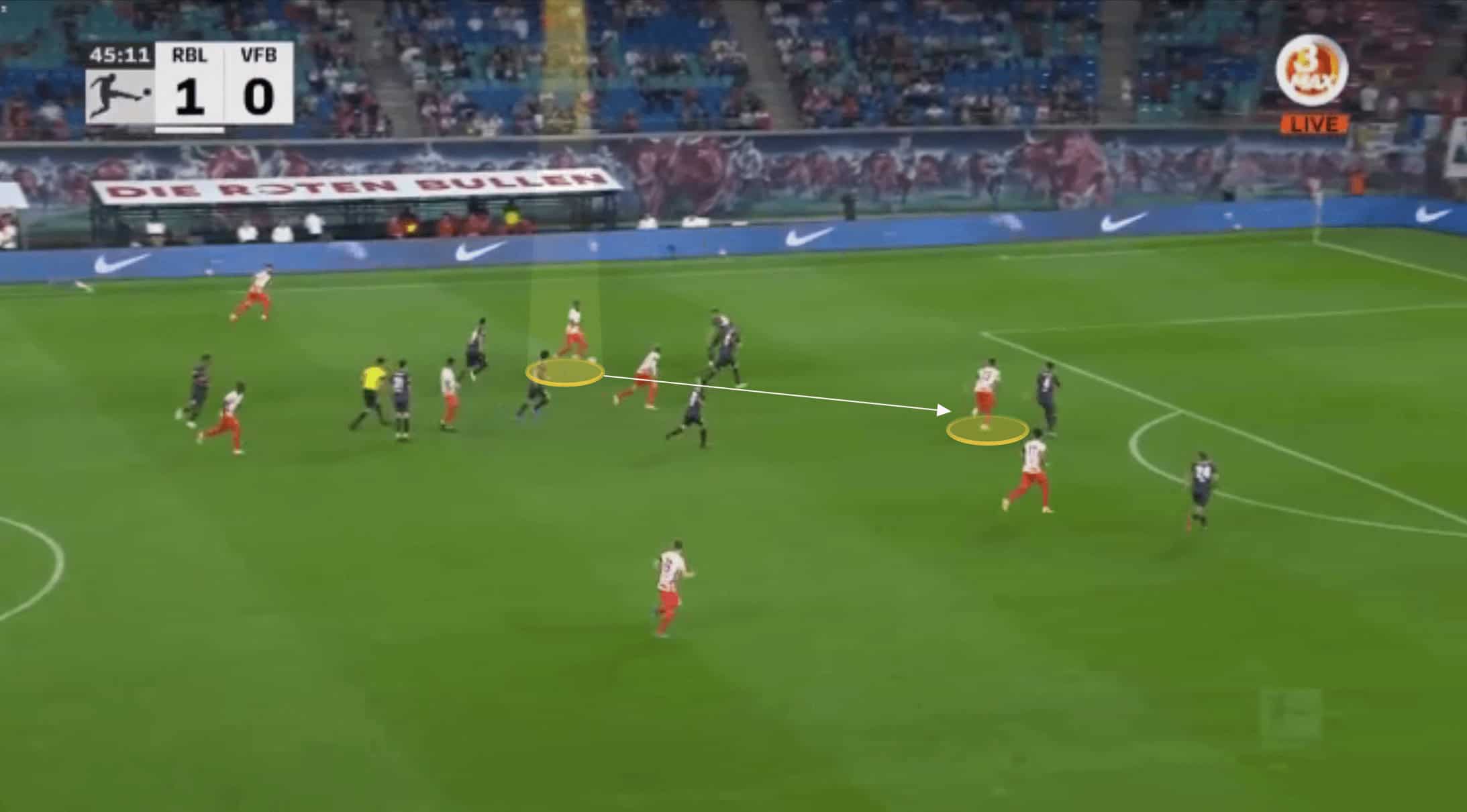 Nkunku shows a variety with his passing too. He shows innovation and ingenuity to disguise his passes and whilst he doesn’t always look to hit difficult passes, valuing retaining possession too, he can play passes few midfielders can pull off. Below is a perfect example of this against Bochum, where he disguises the forward pass shown, hitting a no-look lofted pass over the top for his teammate to run onto.
