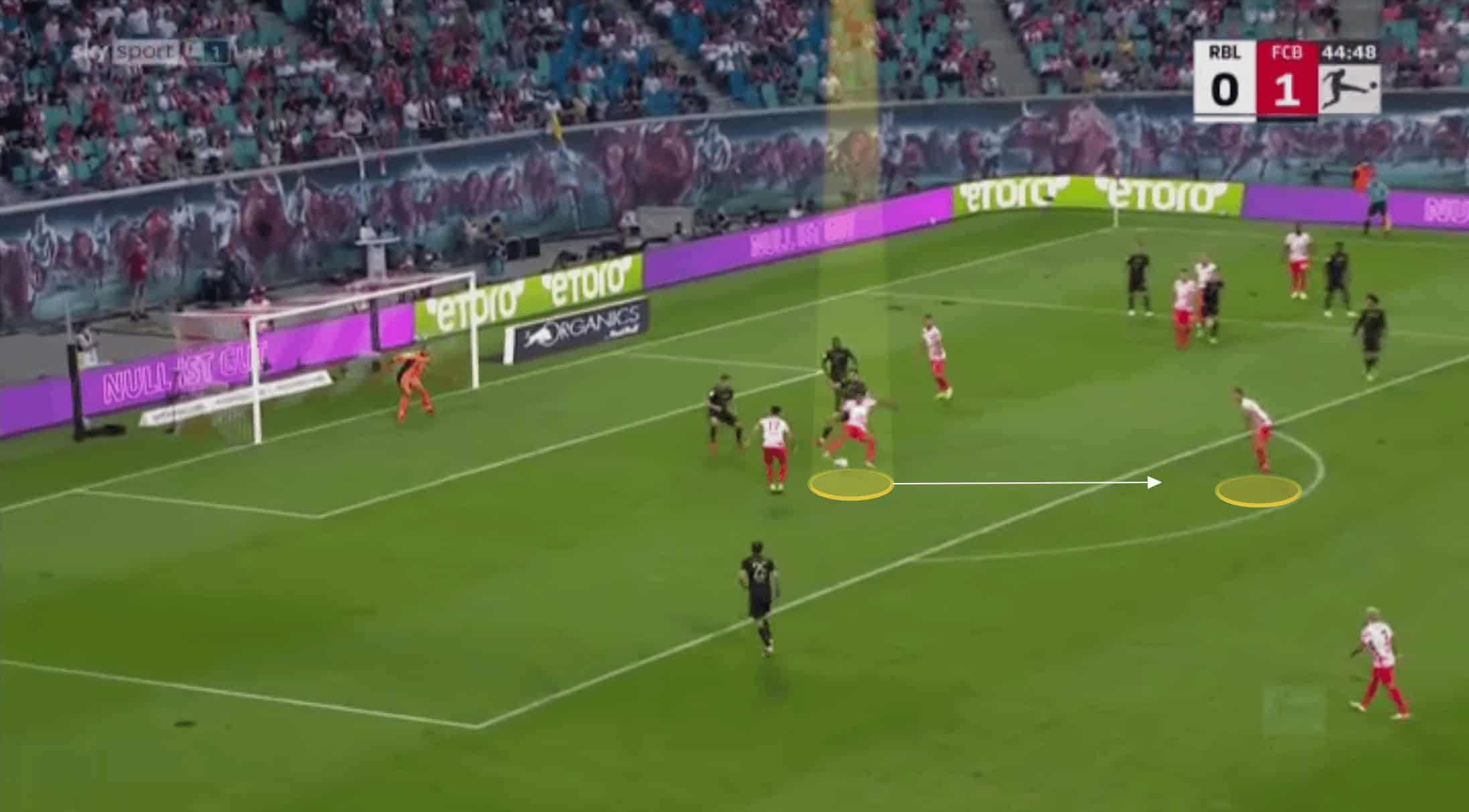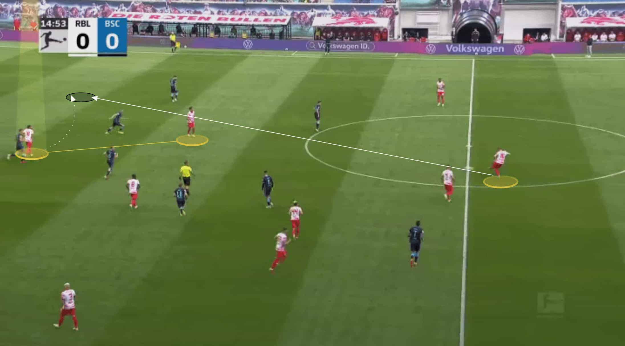 These chances don’t just occur when the centre-forward has possession either. Leipzig’s centre-backs will look to punch balls forward from deeper areas. In the example below, Yussuf Poulsen drops deep and his marker comes with him. Nkunku is in a more narrow position thanks to left-back Angelino’s high positioning down the left flank. He curves his run into the space vacated by Poulsen where he can latch onto the through pass.