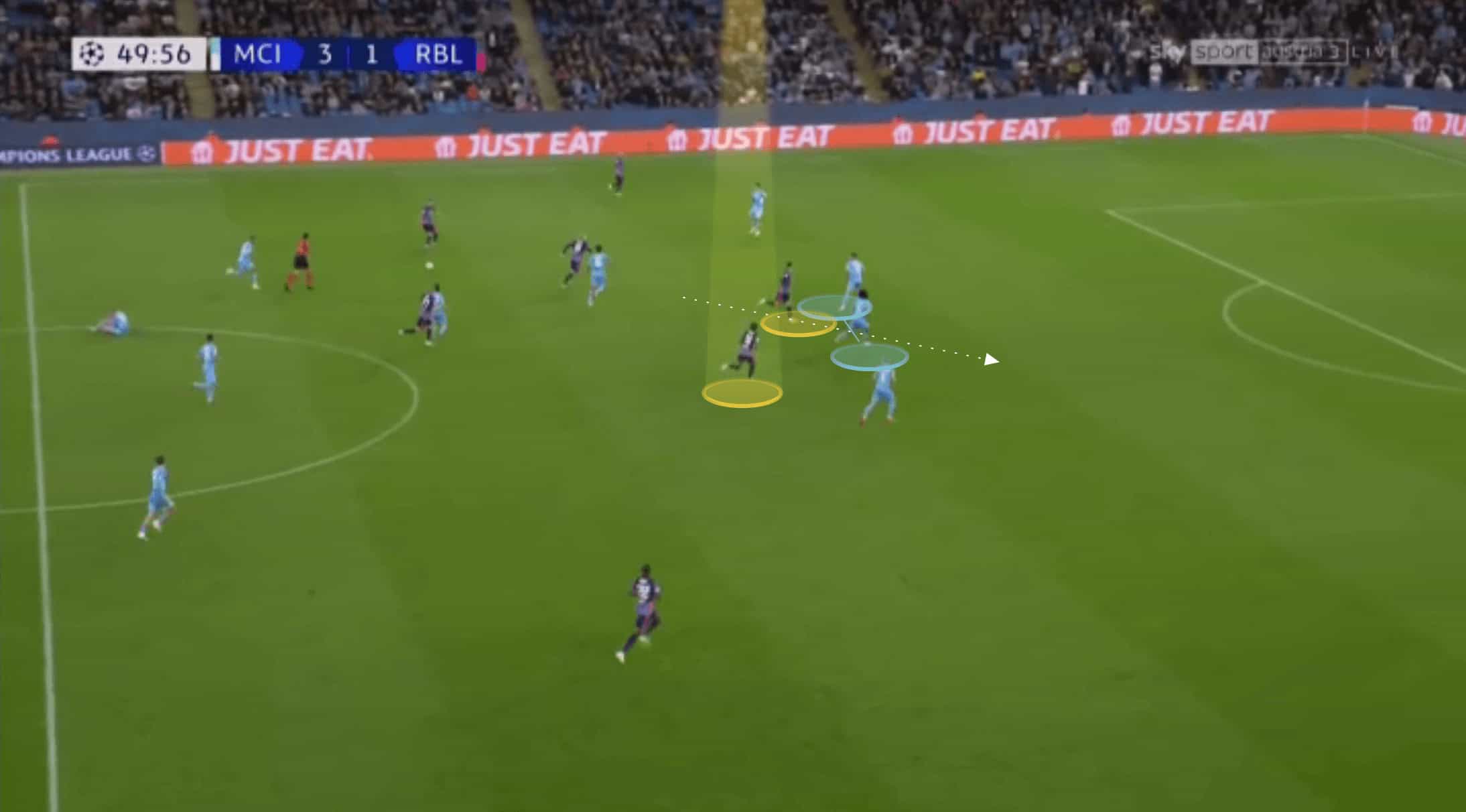 Below Andre Silva is the centre-forward this time and as the ball is in midfield he makes a run away from the action, drawing Manchester City centre-back Nathan Ake away from his teammate Ruben Dias. We can see in the image below how the pair are initially incredibly compact, with Nkunku lingering just off of his centre-forward teammate.