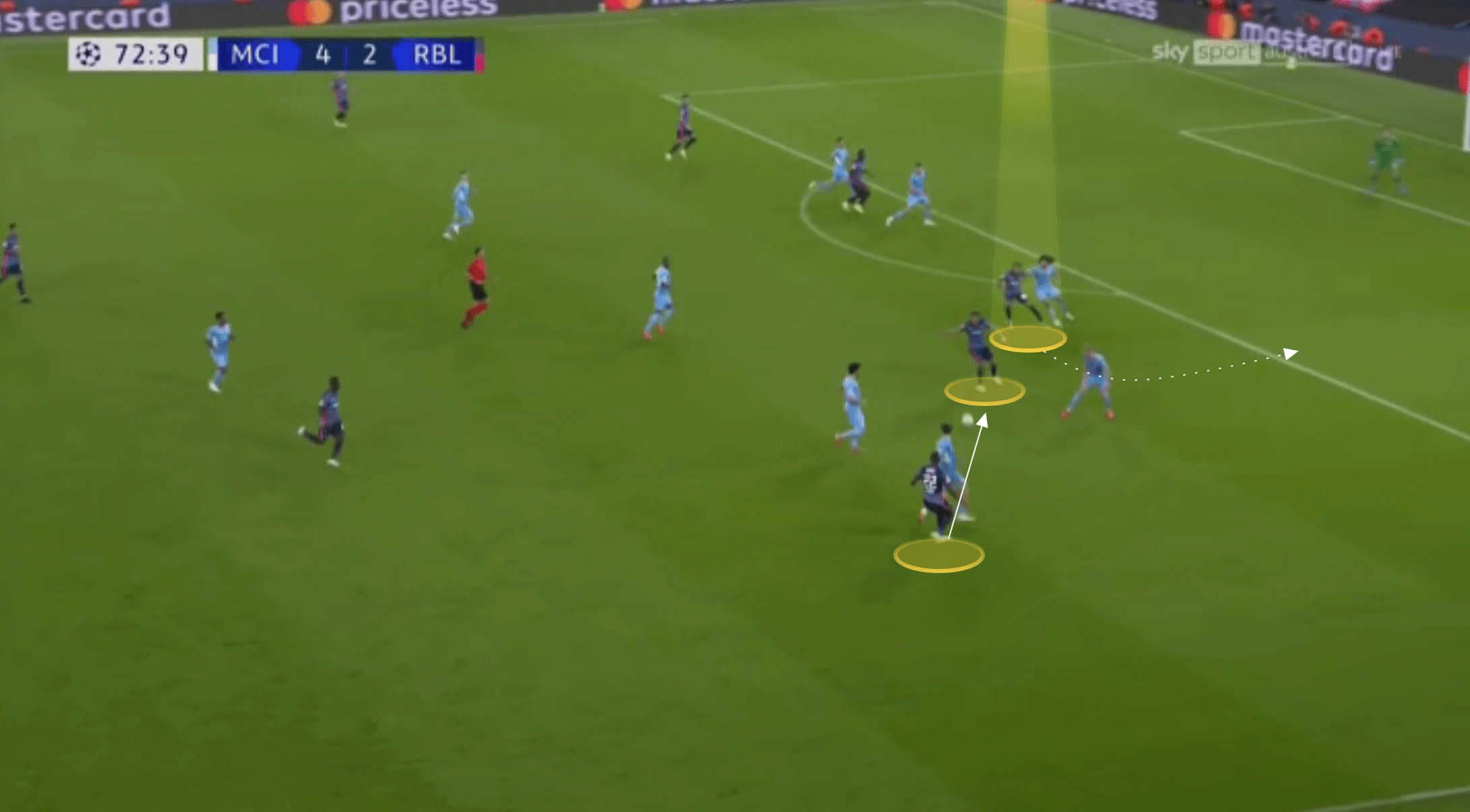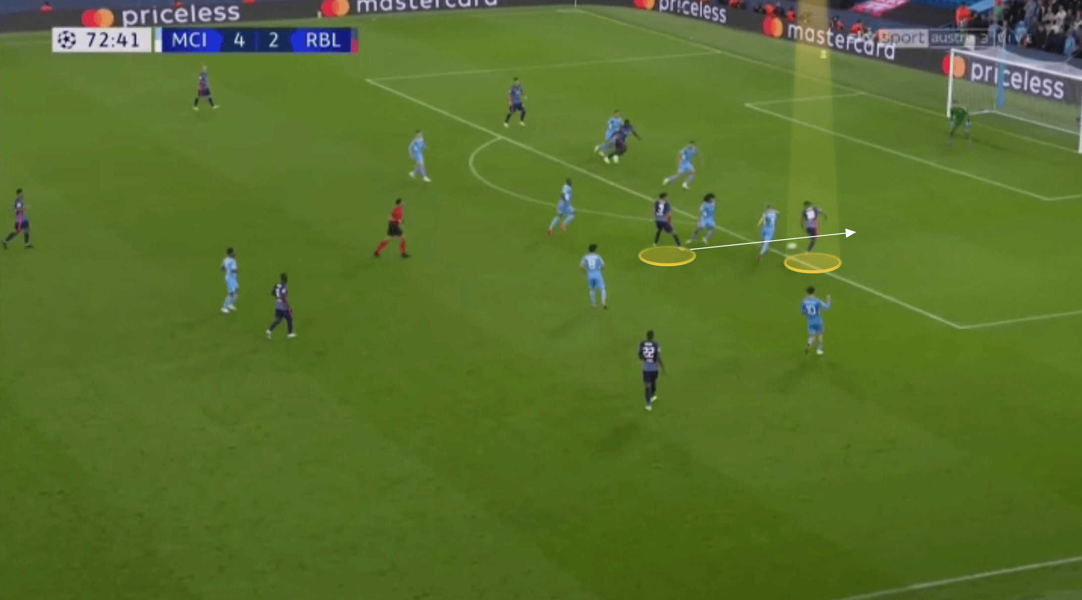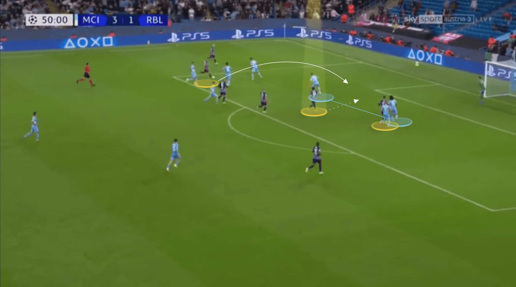 As the ball is advanced, Andre Silva still remains in a position towards the back post. Nkunku is able to make a late run in between the two City centre-backs where he meets the cross and heads home his second goal of the game.
