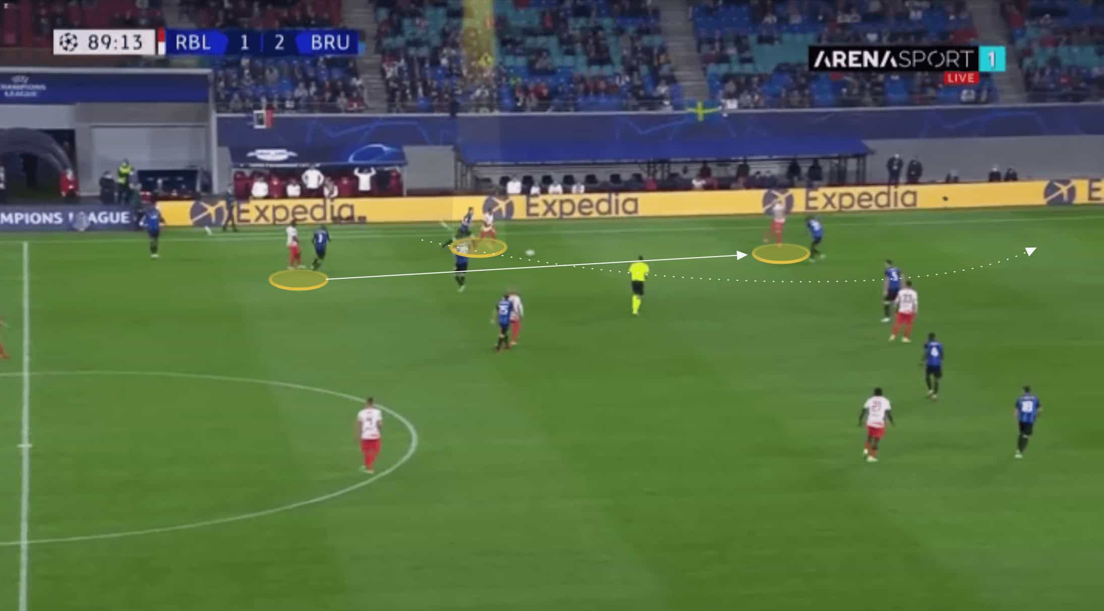 Nkunku wants to ensure he leaves space behind the defence for him to receive through passes. He has excellent top speed and acceleration and when playing against a defence with a high line, as in the image below, Nkunku will look to angle a run in behind. To do so he takes a wide position, often looking to place himself in line with the last line of the opposition defence.