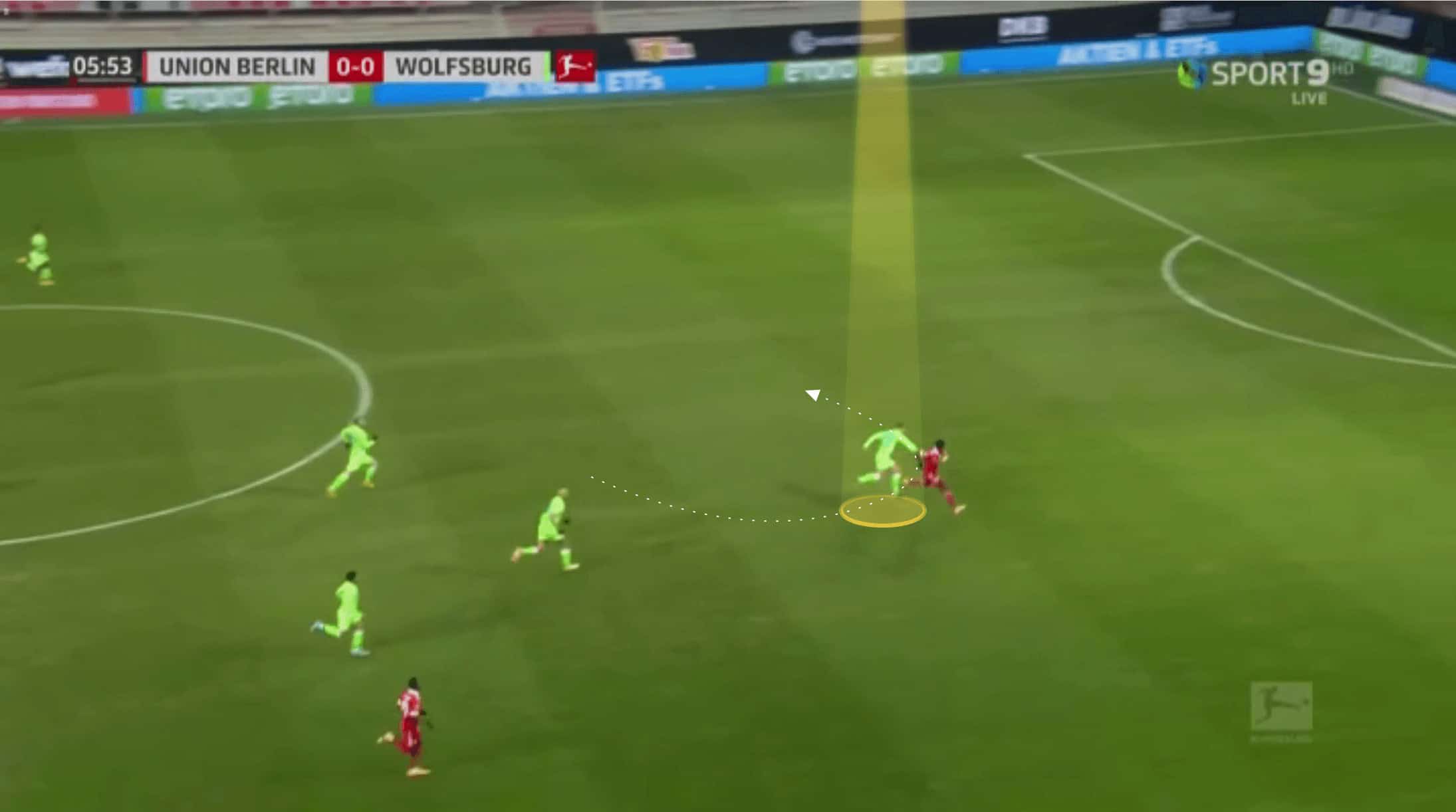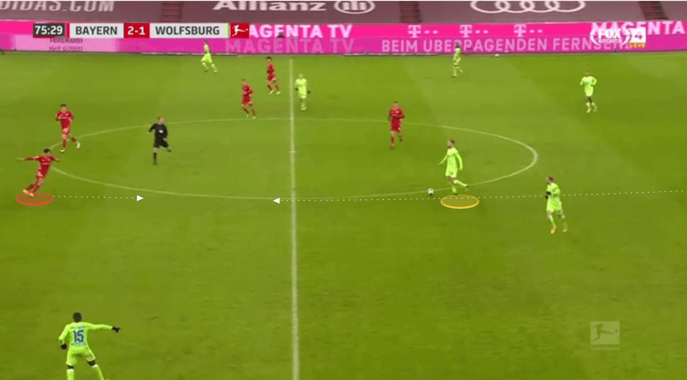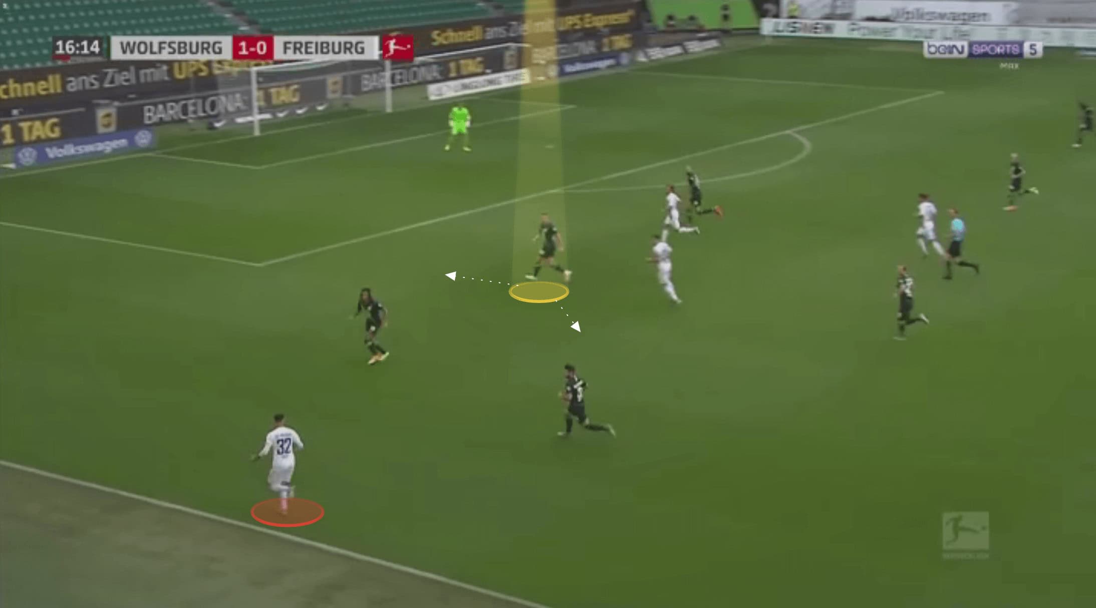 In this case, he does change direction, stepping forward into the highlighted space and making the interception, getting to the ball before the Freiburg forward.