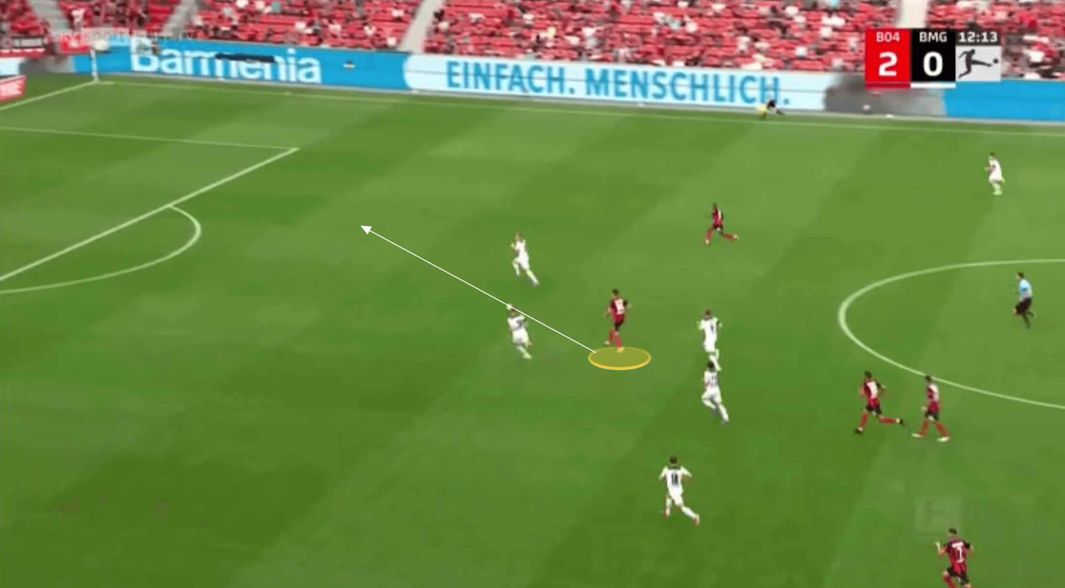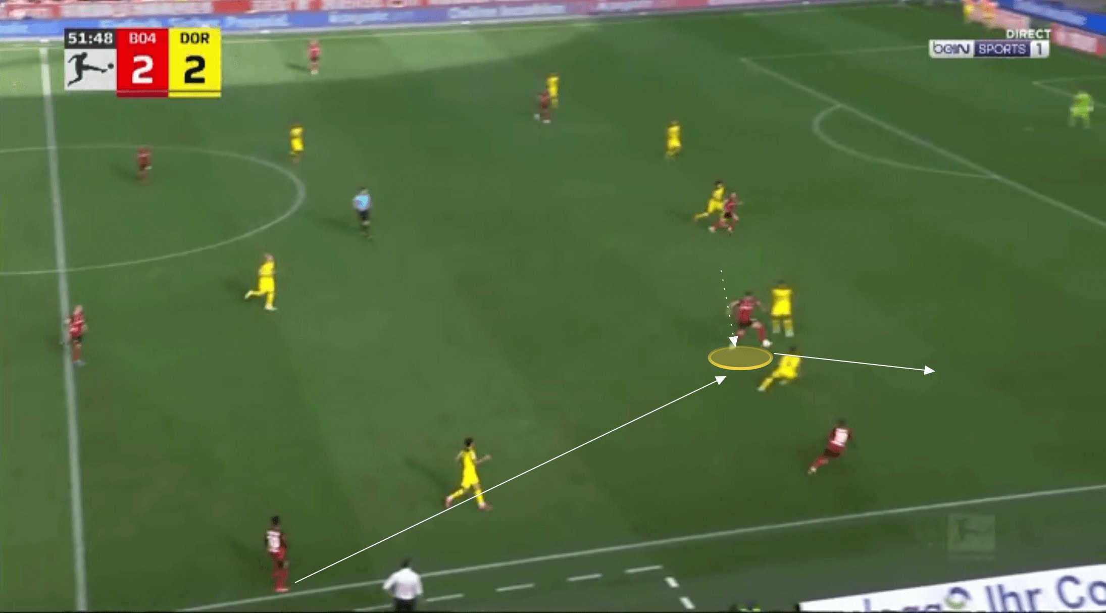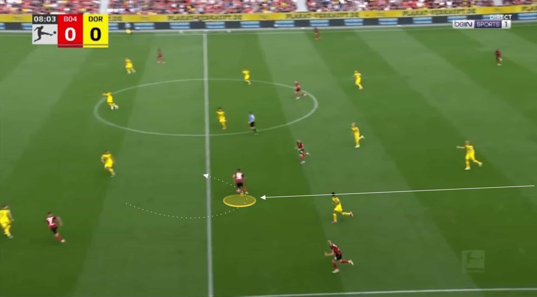 Schick will drop well inside his half at times to get on the ball. Whereas more traditional target players might lead the line and play man-on-man against the centre-backs for the majority of the game, Schick is given more freedom by Leverkusen to drop into deeper areas as he sees fit. He can evade tight marking to receive between the lines, and from these areas he may choose to break the last line with a through pass.