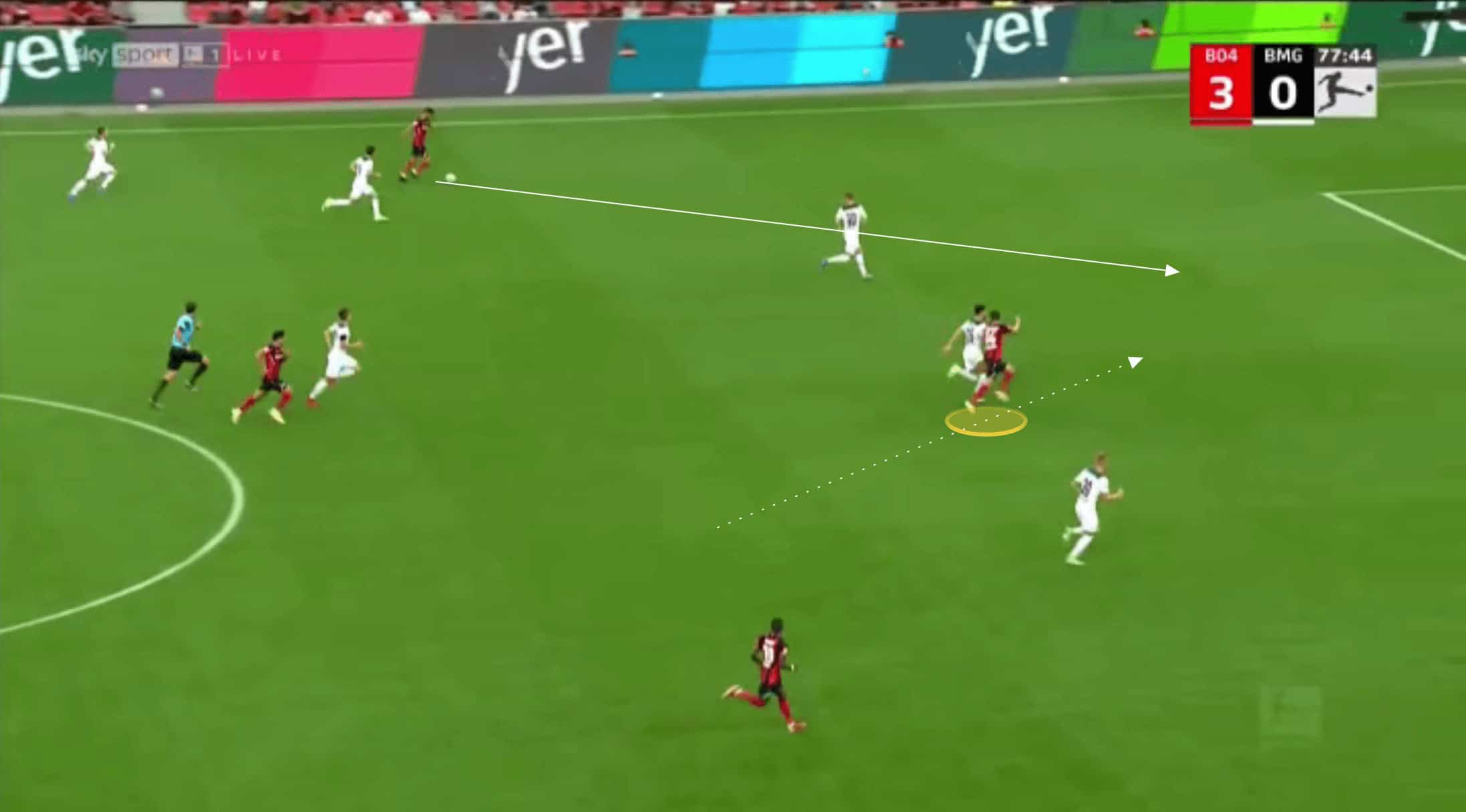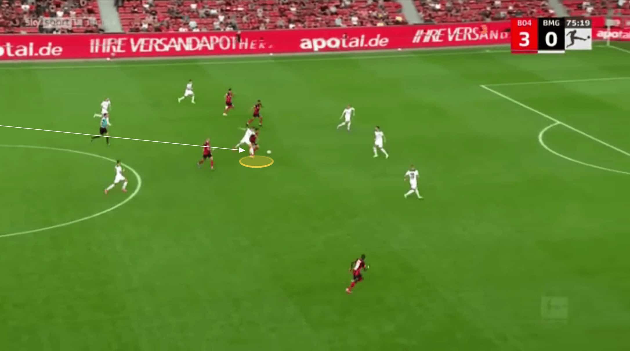 Schick will use his body to back into defenders tracking back, as forward passes are played into him. He can create contact between himself and the defender. If receiving in an area where he is outnumbered and there are limited forward options he will use this as a chance to win the free-kick and have Leverkusen be able to structure an attack from a dead ball situation. However, he also uses this to give himself time on the ball, and therefore create time for his wide attacking teammates to make runs in behind. In the image shown below, he retains possession and gives the attackers either side of him valuable seconds to continue pushing forward into attacking positions.