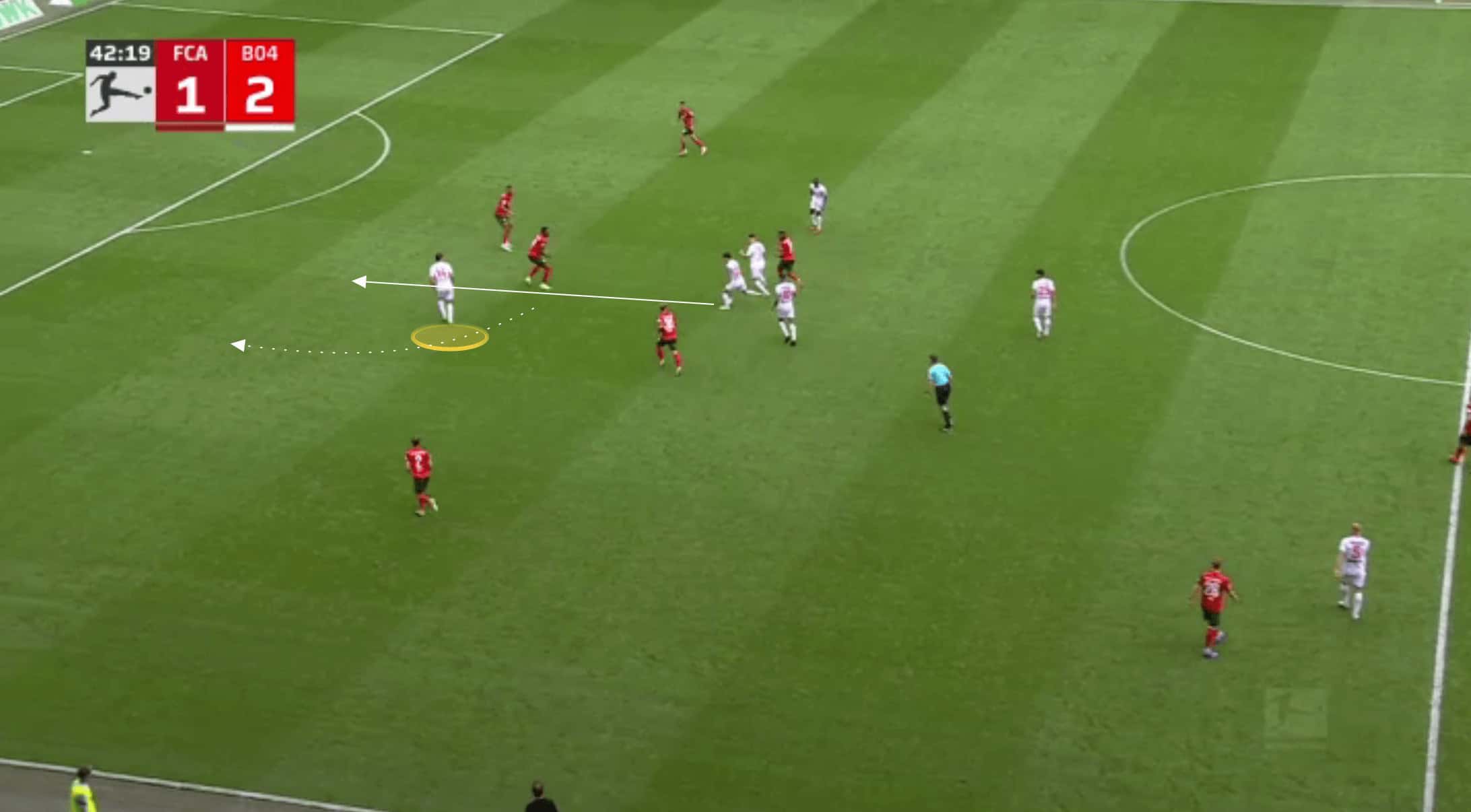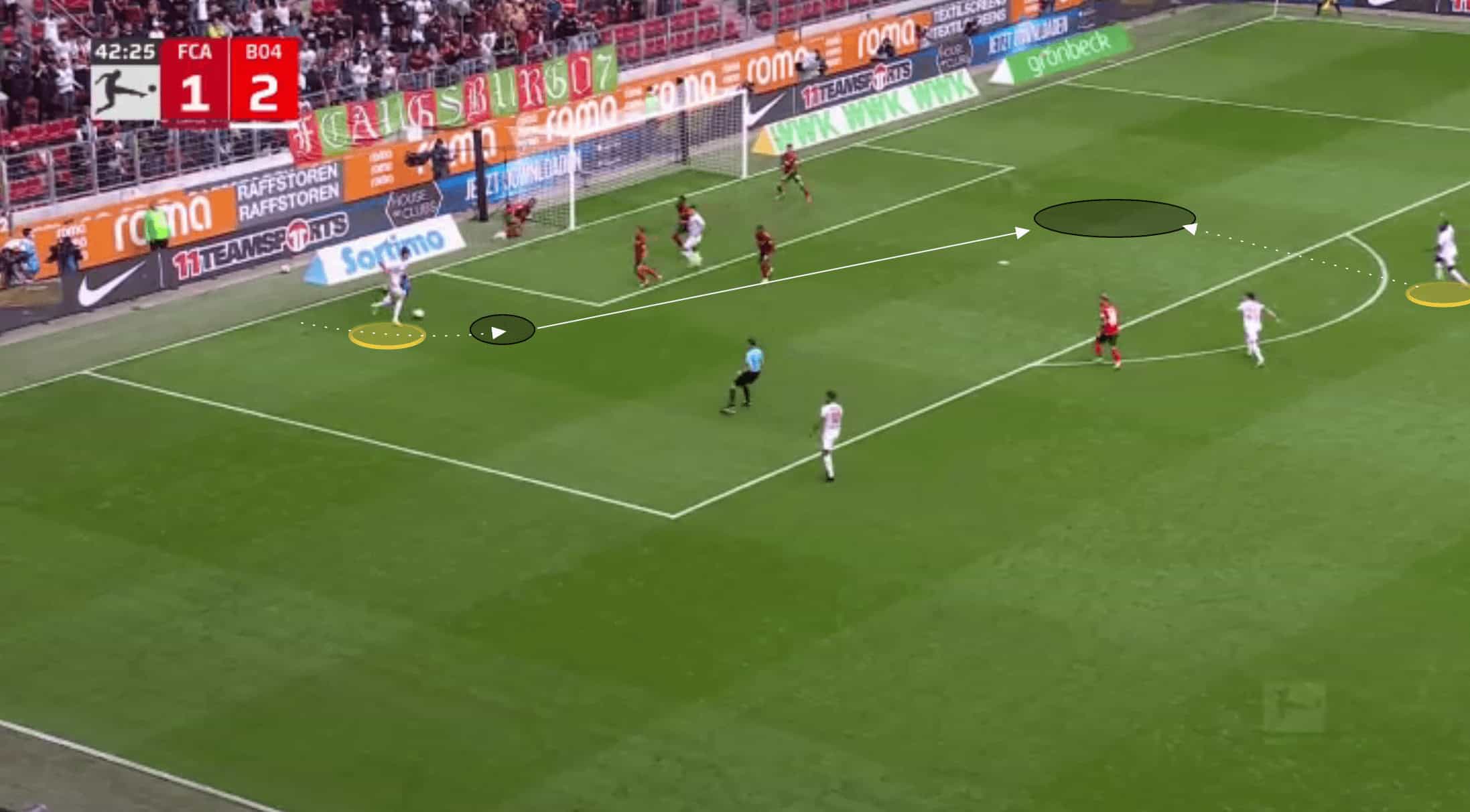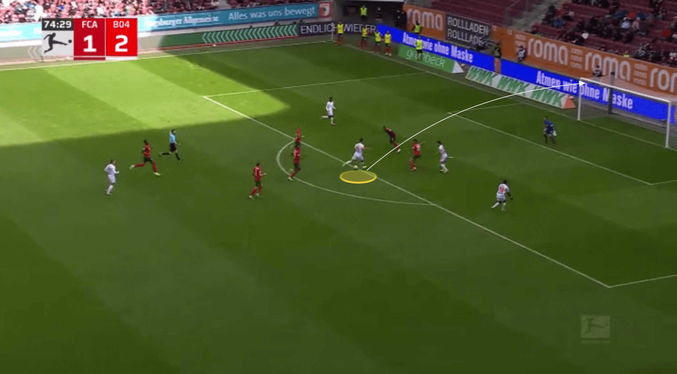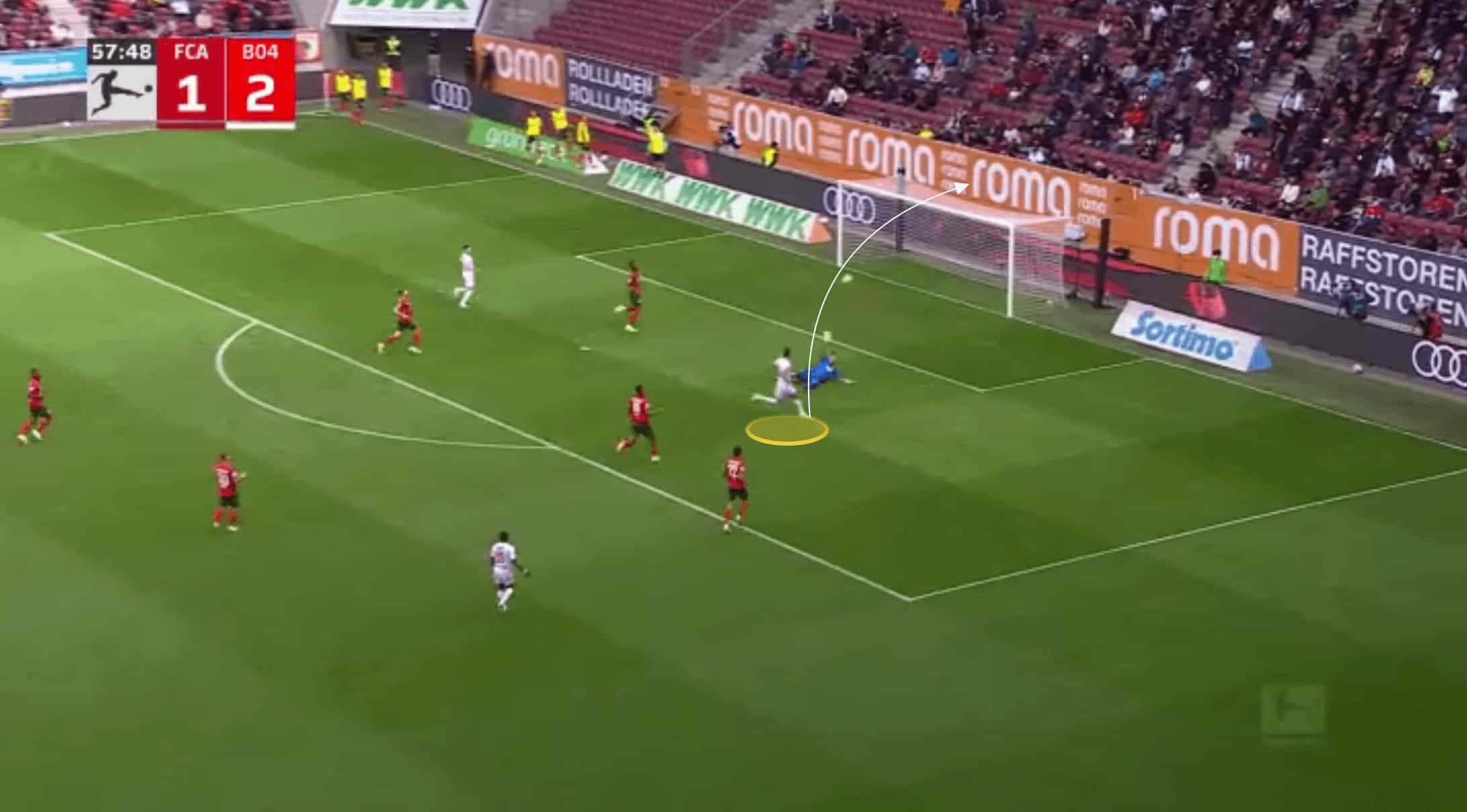 Schick was played in behind and initially rounded the Augsburg keeper, but decided the angle was too tight to finish from. Instead of attempting the shot, which would have been highly difficult to score from, Schick showed the composure to cut back onto his right, forcing him to have to round the goalkeeper once more. From this position, he was then able to find the winger arriving on the far side of the box, who was able to score.