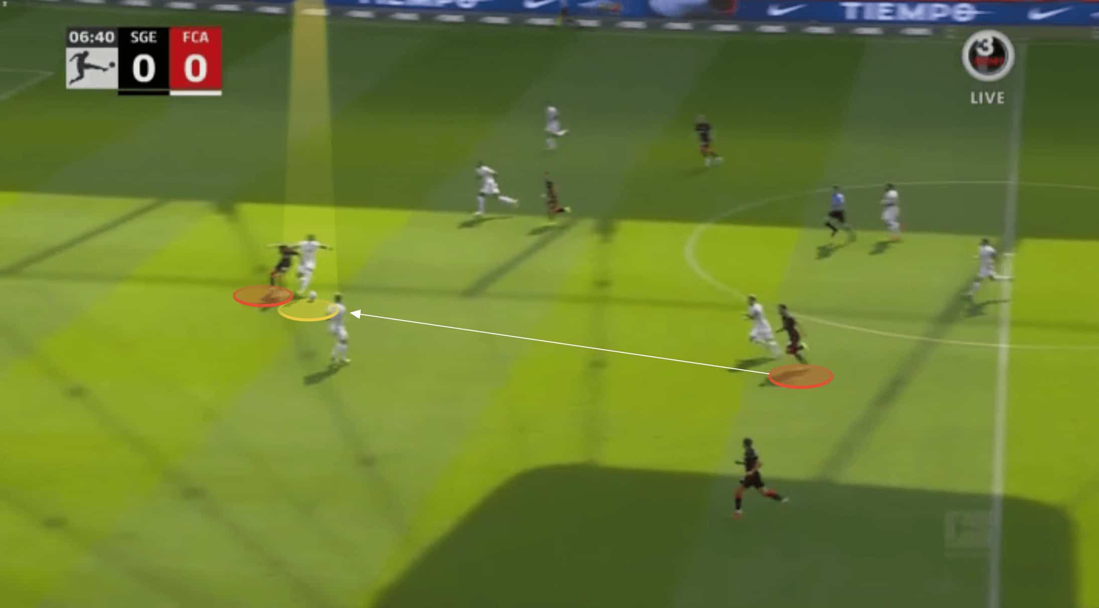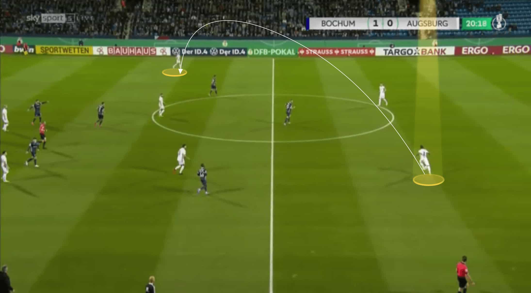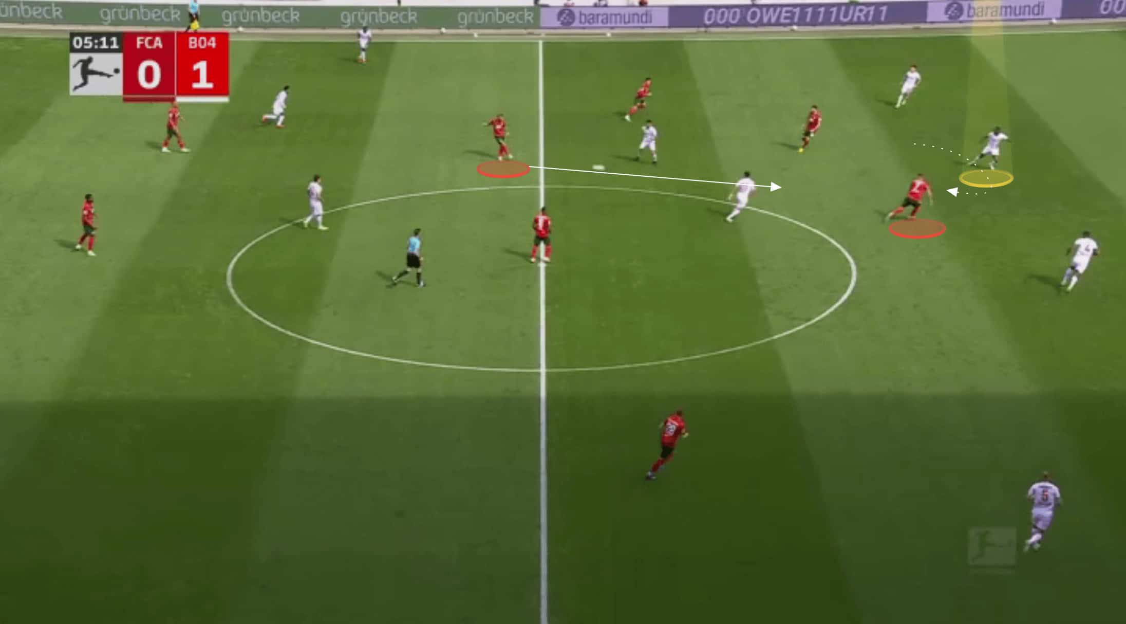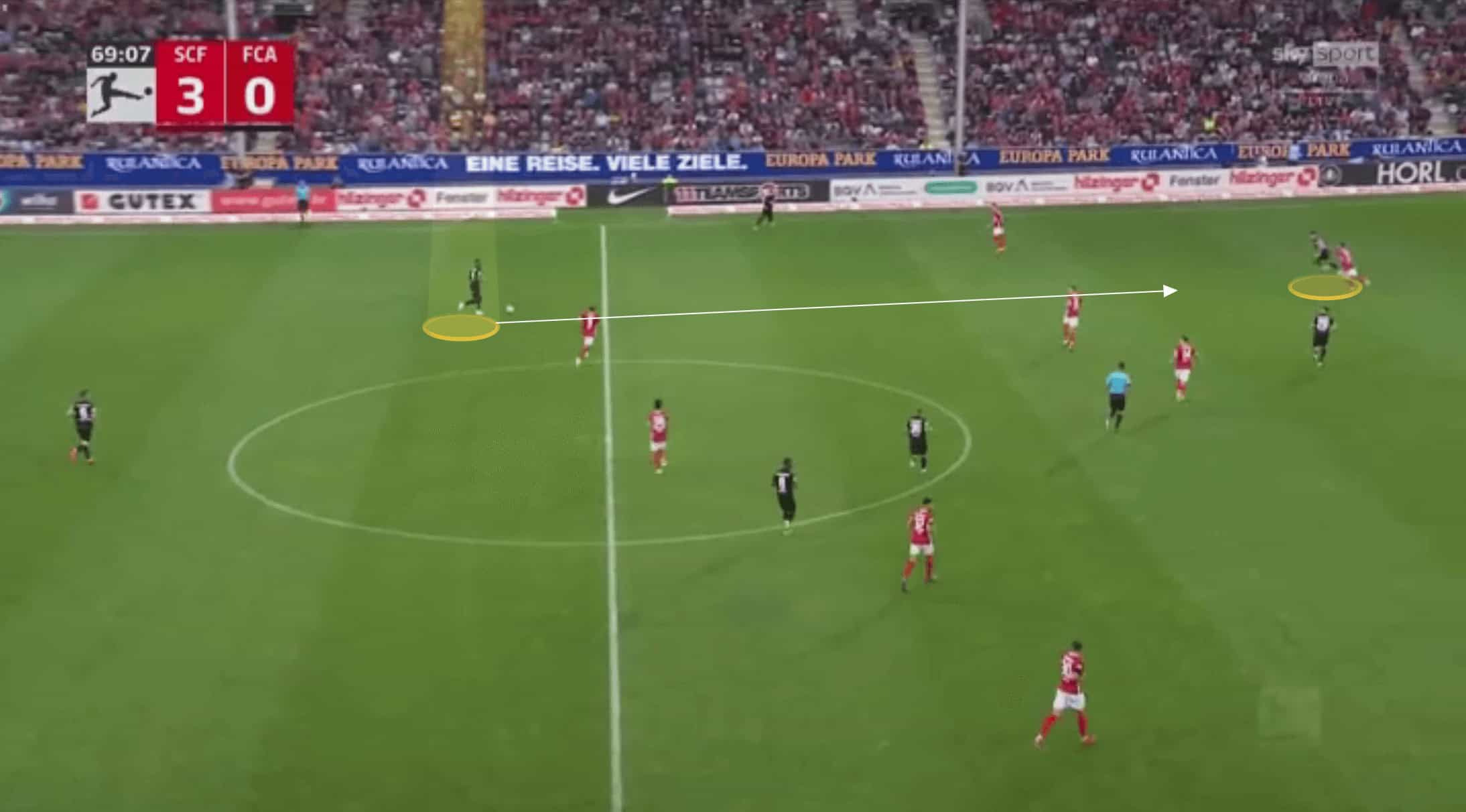 Oxford has been deployed this season as a left-sided centre-back, generally in a back four, however, Augsburg have experimented with a back three and again Oxford has found himself on the left side. He is right-footed, but it is a testament to his comfort with either foot that he is able to effectively play here. When it comes to more expansive passing he is likely to rely on his right foot, but in general build-up play and ball circulation, he is confident and has good execution when passing with his left.