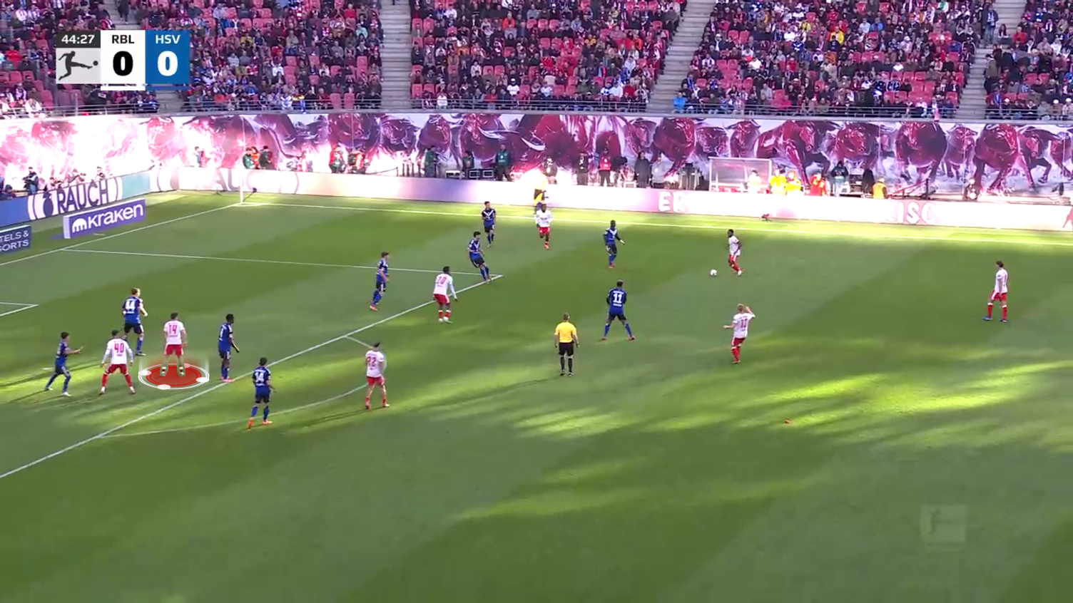 In this situation, he moves well in the shadow of his teammate, but Ridle Baku intercepts the pass targeted towards Baumgartner and switches play for RB Leipzig.