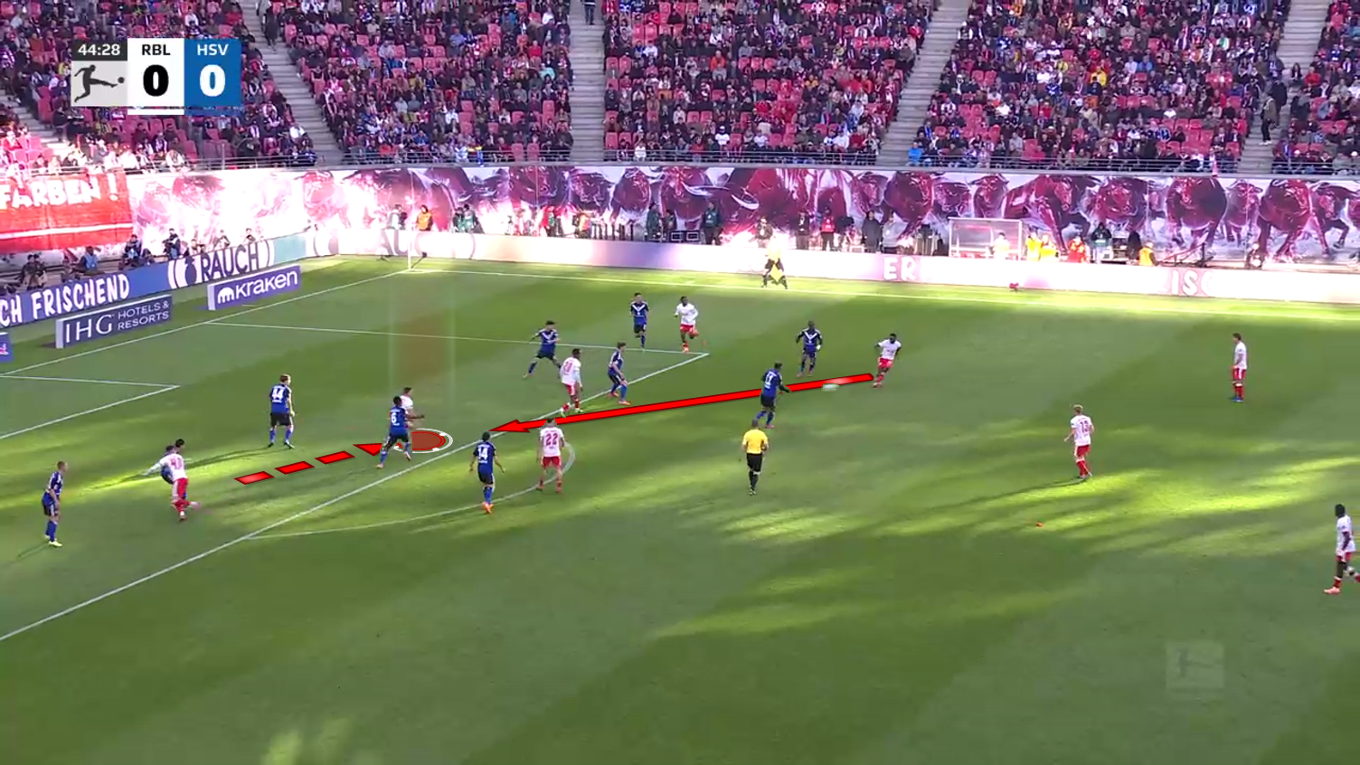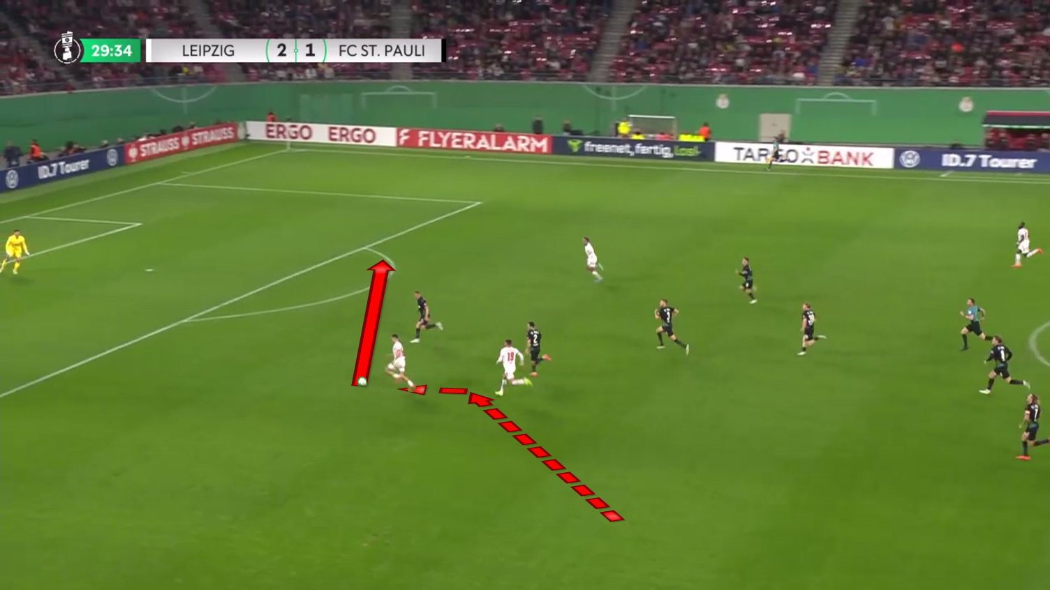 The ball is played towards the far post, and thanks to his quick scan earlier, he knows that one more Leipzig player is behind him.