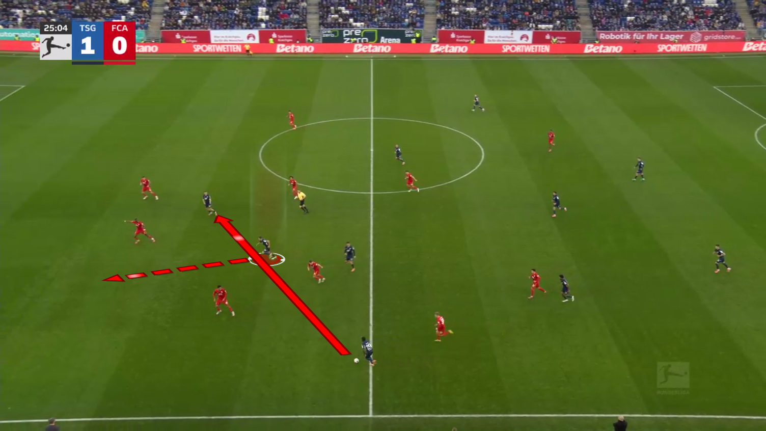 From there on, Hoffenheim switches play to the right side into an isolated 1-v-1 situation.