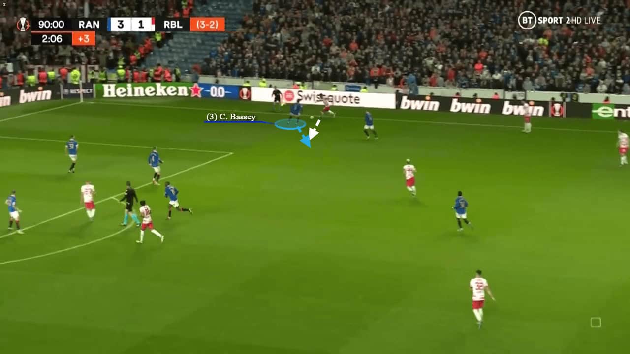 Bassey also uses his long legs to cover larger amounts of distances, with less effort, which allows him to easily keep up with quick wingers who constantly run at him. Furthermore, Bassey uses his large frame to step across defenders if they do manage to knock the ball past him. When Bassey steps across an opponent, he prevents them from getting onto the end of the ball, and once he starts shielding the ball, it is impossible to get around him and dispossess him.