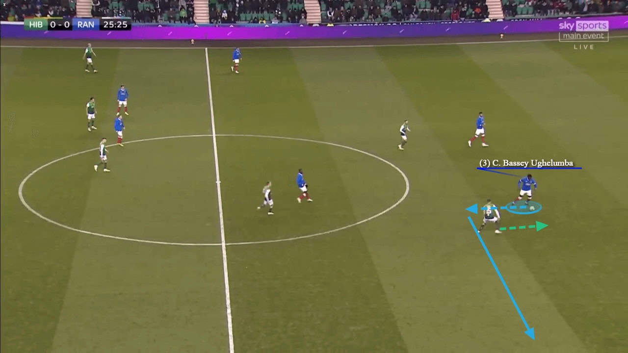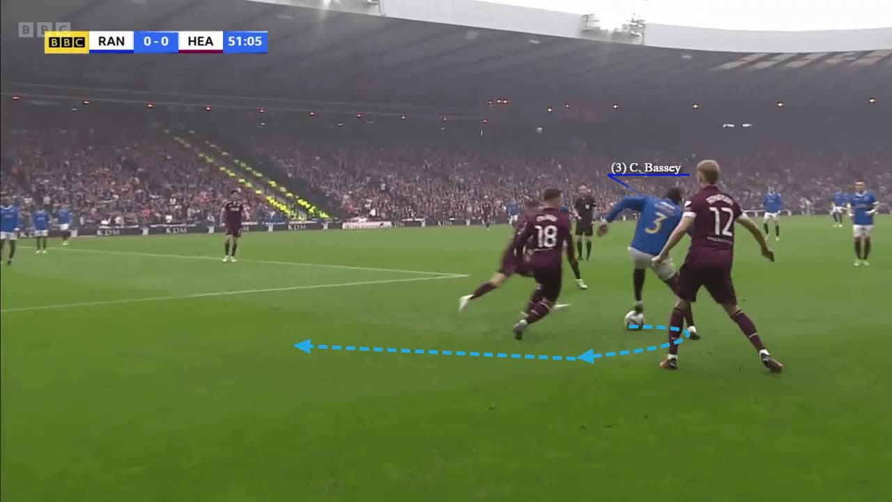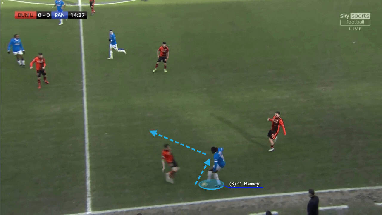 The 22-year-old’s brilliant dribbling ability helped make him a versatile option for Rangers where he often played at left-back and he was comfortable playing in higher areas up the pitch. In a wide area, there is less jeopardy if you do lose the ball, so Bassey could afford to take the risks when dribbling further up the pitch. The image below displays his ability to evade pressure, by skipping through two opponents and drawing a foul when surrounded by four players.