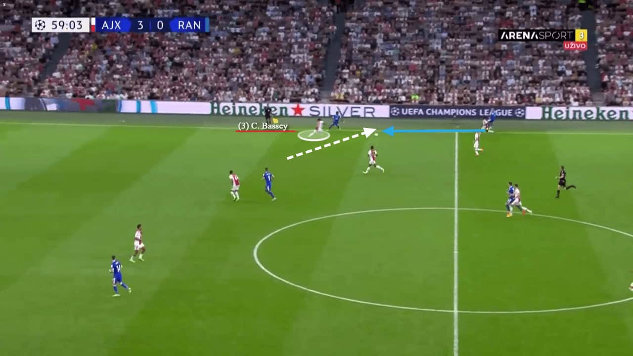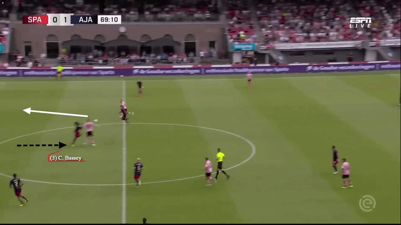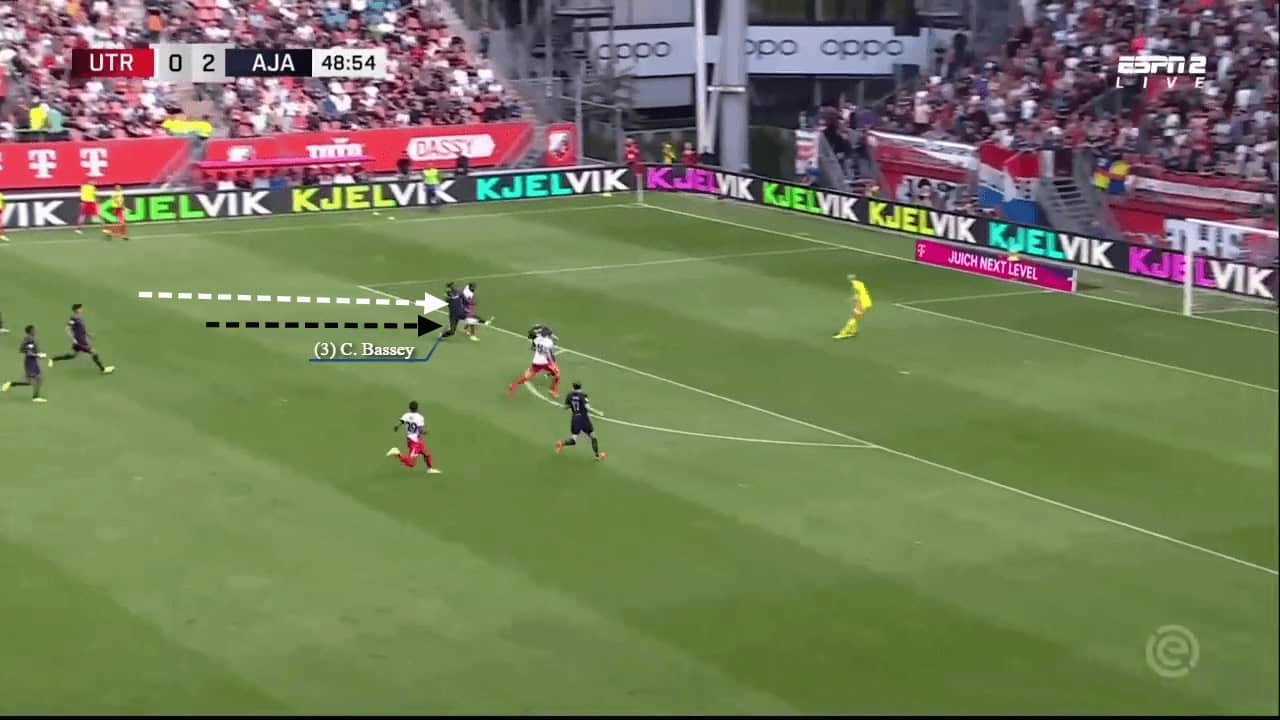 While Ajax do play a short passing style, based on maintaining possession of the ball, there are times when opposing teams leave players further up with lots of space and time. On these occasions, players responsible for the build-up, like Bassey, must have the skill set to find the open players and unlock defensive structures with one pass. The image below shows Dusan Tadic getting onto the end of a long diagonal ball over the top by Bassey. He perfectly picks out Tadic, who was in acres of space and allows Ajax to begin another dangerous attack.