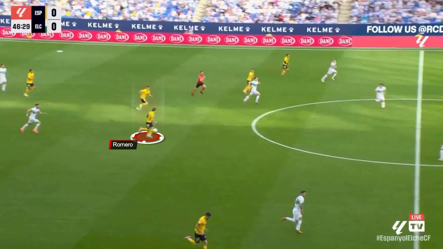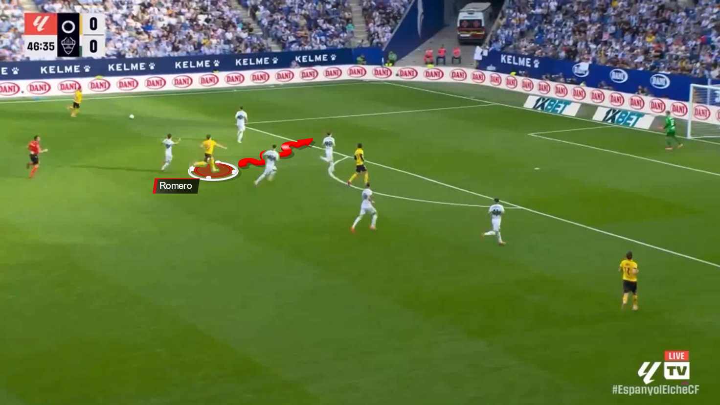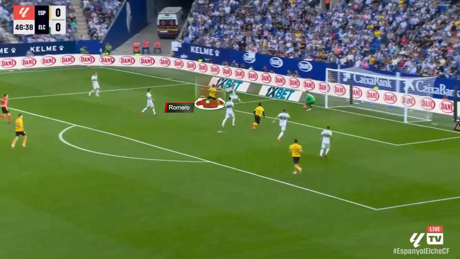 Upon regaining possession in the middle third, Romero launched an early run behind the right-back, exploiting Elche‘s high defensive line and their focus on pressing.