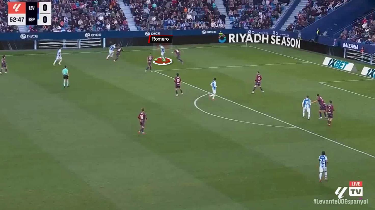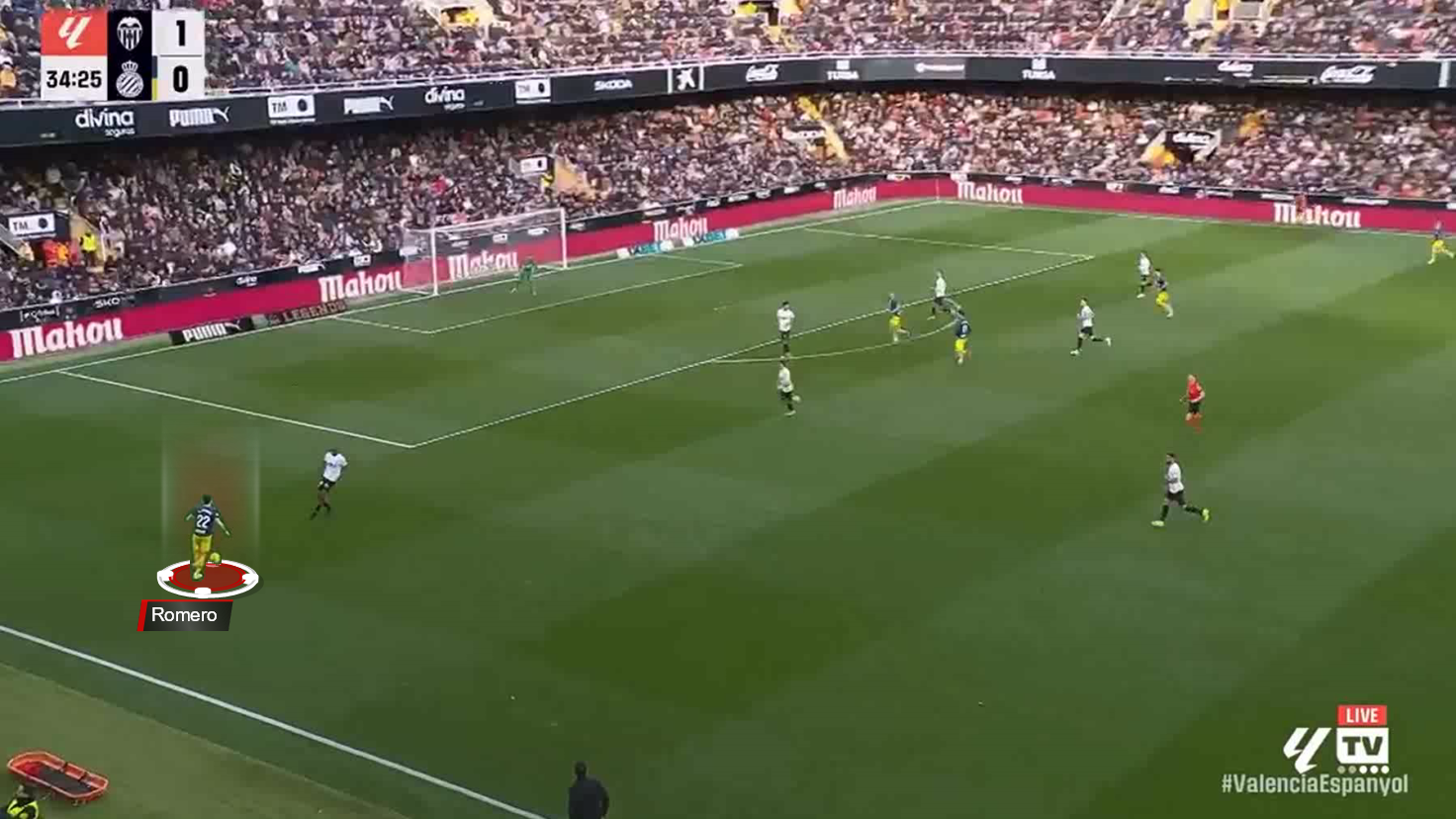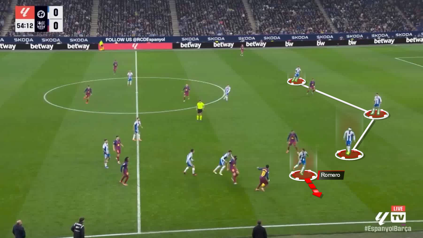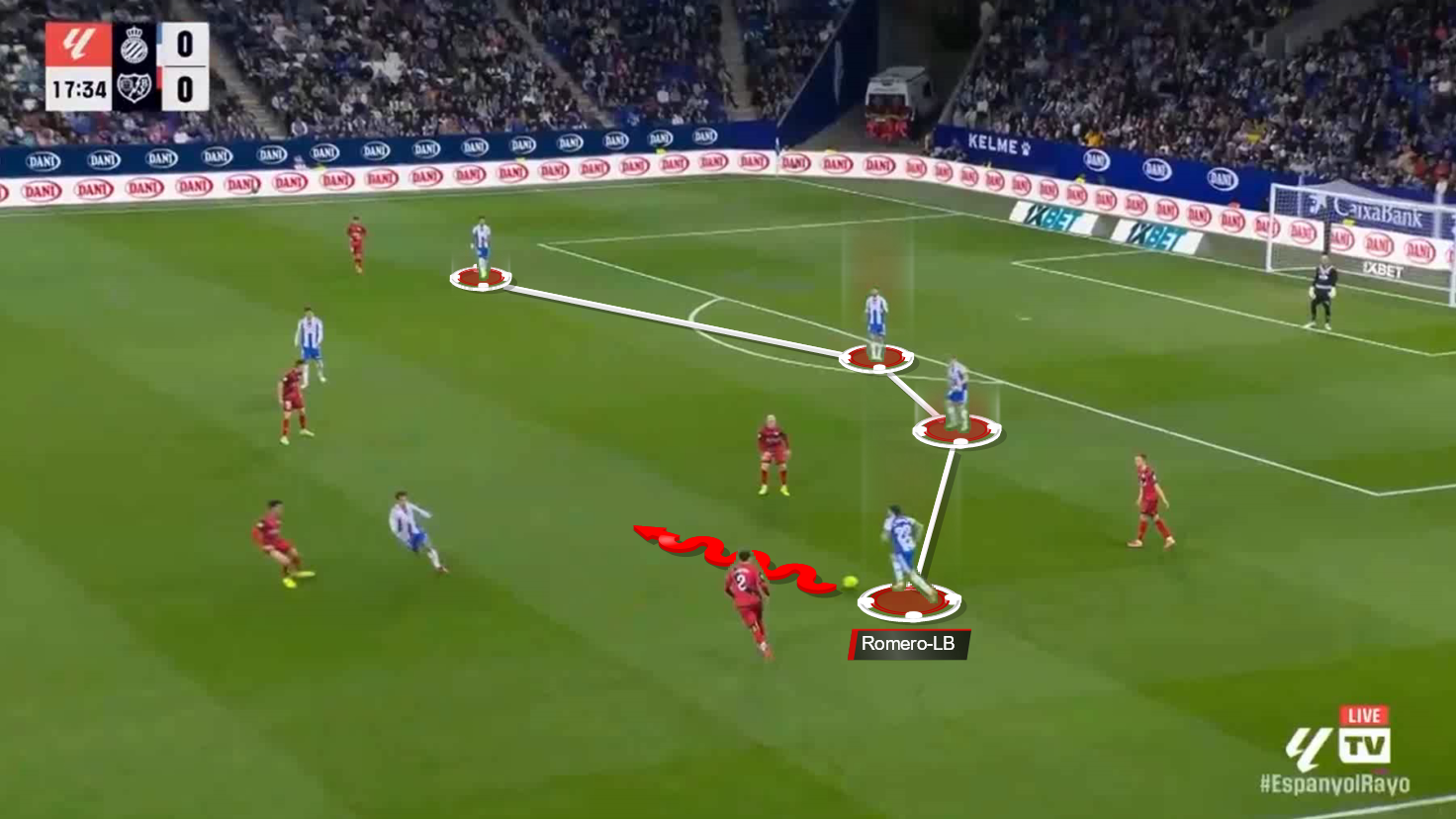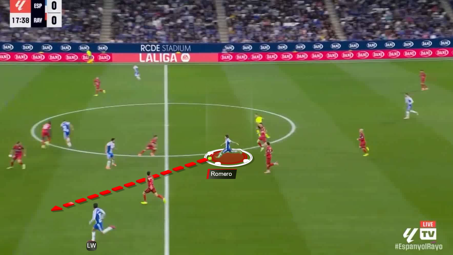 Here, against Rayo Vallecano, Romero moves diagonally to the middle, where all the Espanyol midfielders were marked, and breaks through the first two lines of pressure.