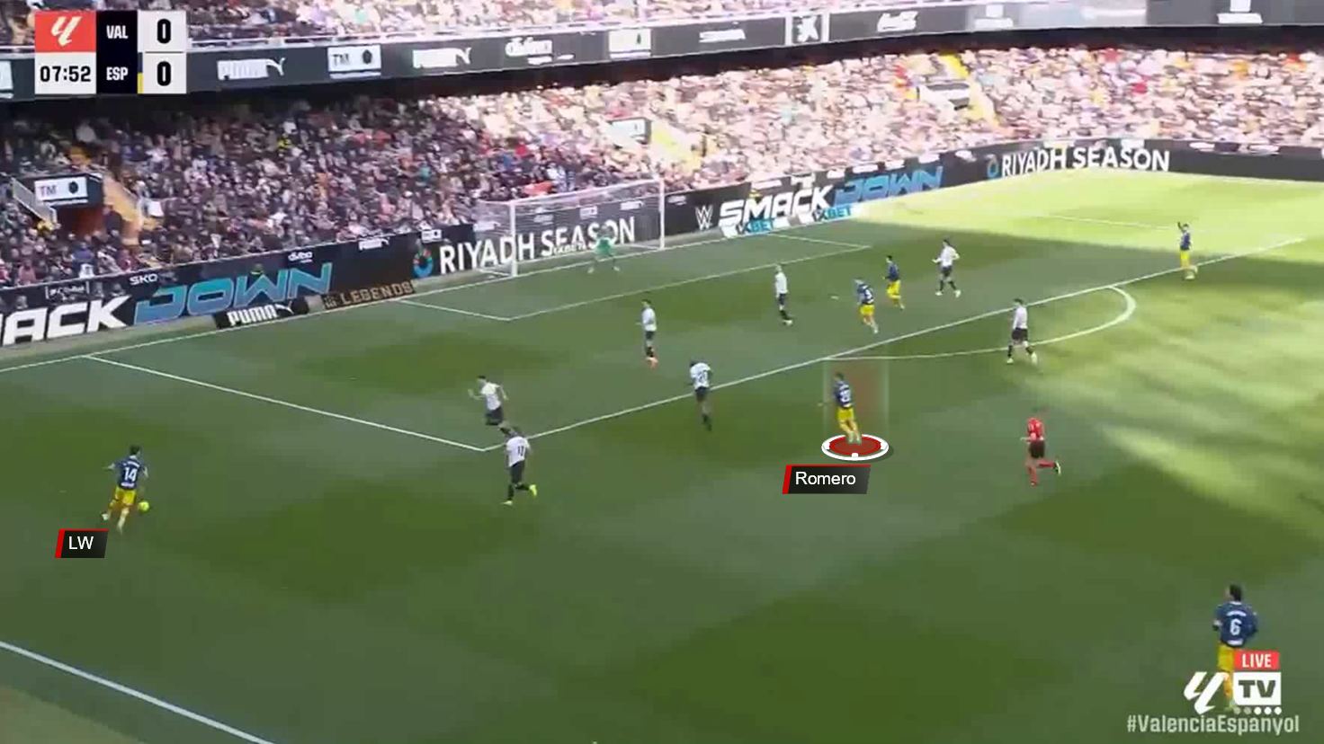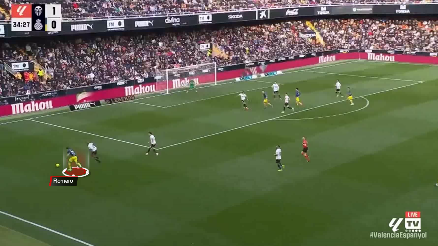 This interchange left the Valencia midfielder hesitant, unsure whether to come out and mark Romero or maintain his position, while the full-back was reluctant to leave the flank.