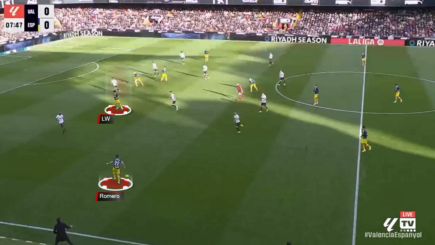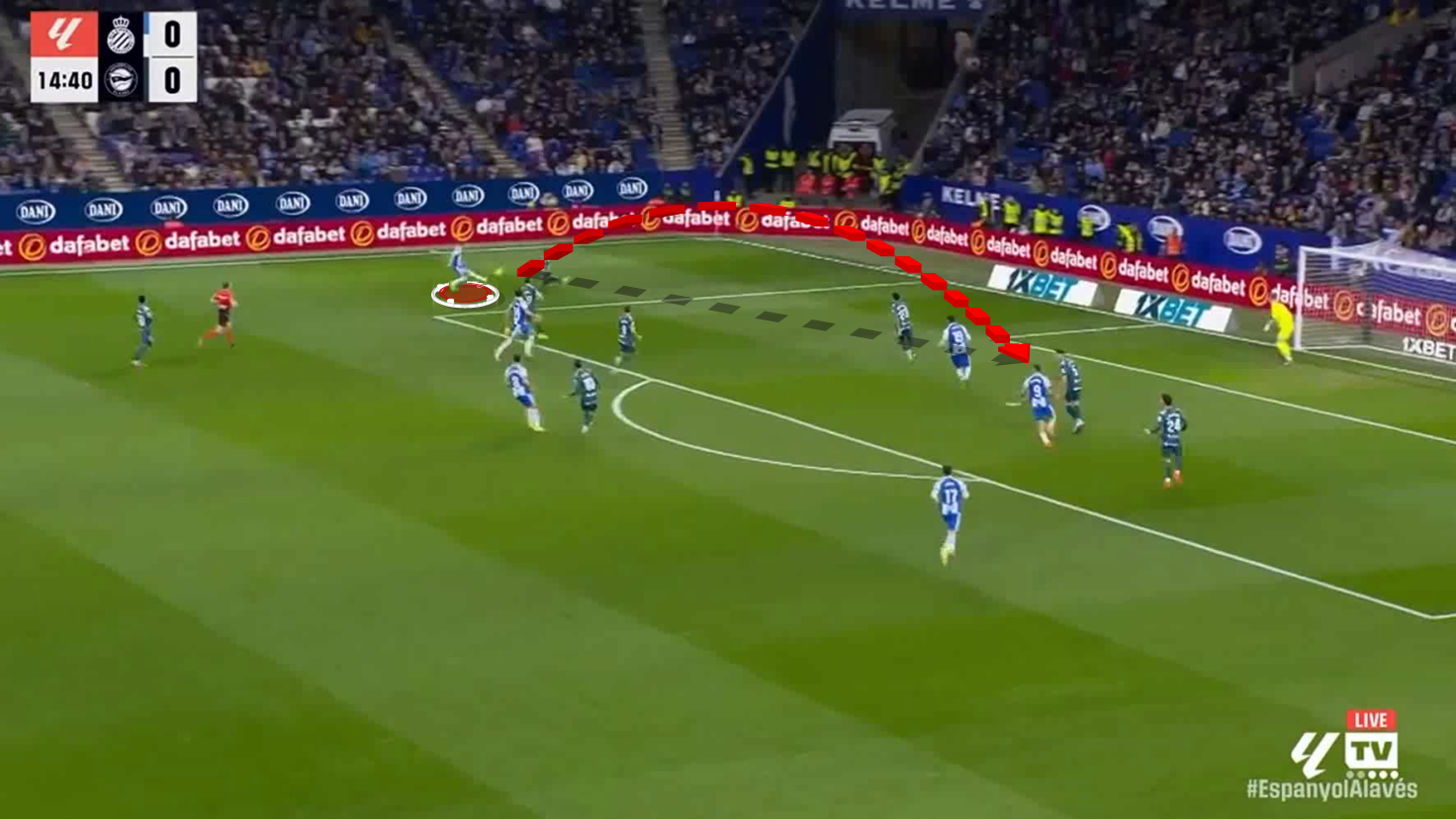 Instead of maintaining a wide position, he often drops a step or two inside, creating an additional passing angle with the centre-back and holding midfielder, allowing Espanyol to play the ball out in an organised manner under pressure.