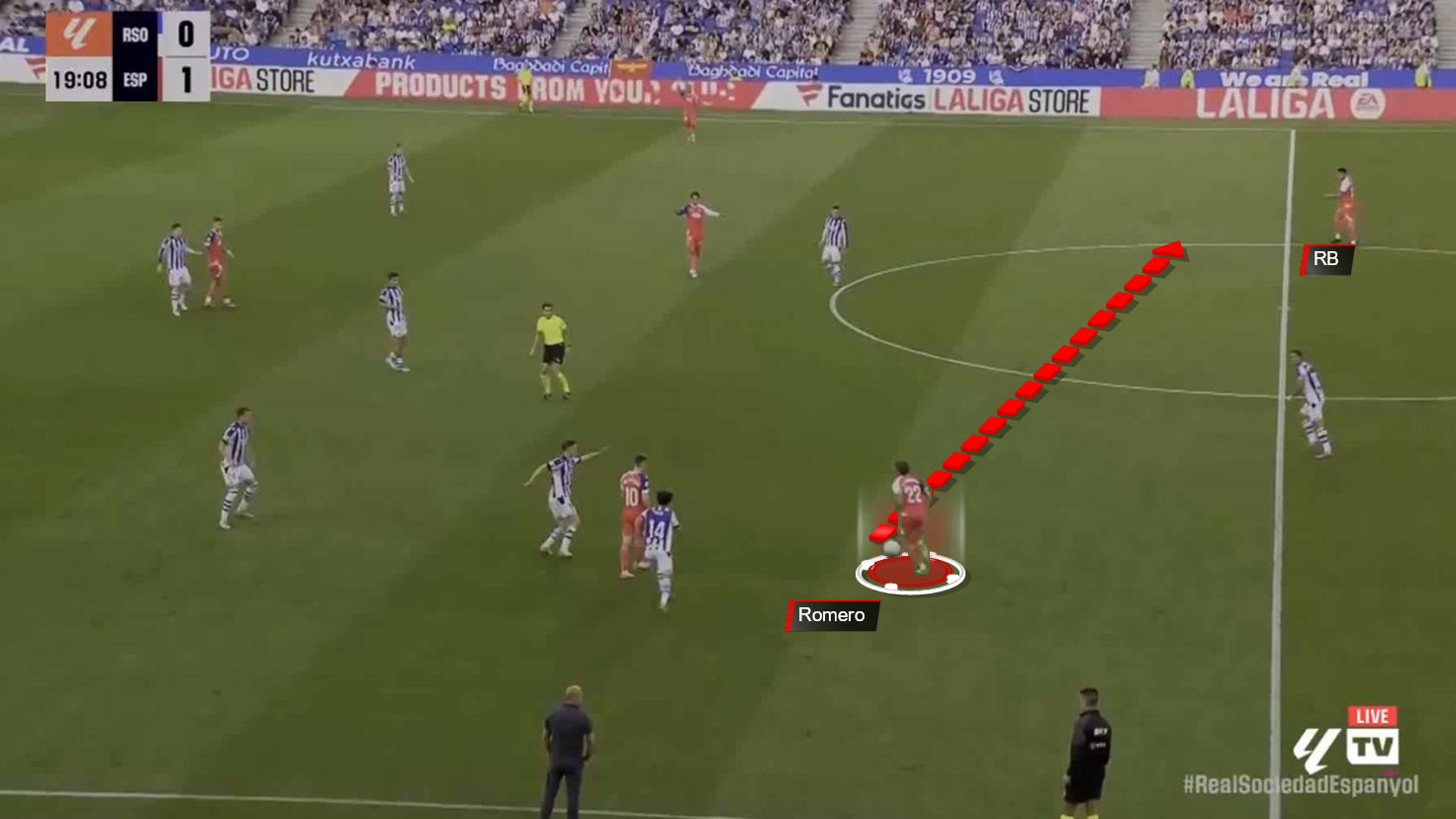 This decision created a clear moment of hesitation for Sociedad’s right winger: should he follow him and leave the line wide, or maintain his position and allow Romero the freedom to receive the ball?