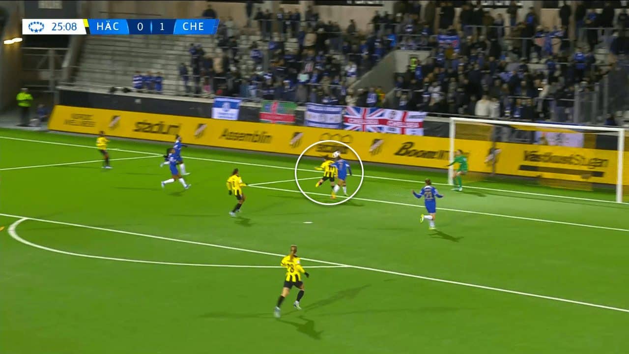 Larisey got the ball and quickly served her teammate with an excellent through pass behind the defensive line, which made things easier for BK Häcken’s player and a lot more complicated for the defence. This pass type can be used more often to create similar goalscoring opportunities and exploit Larisey’s playmaking talent.