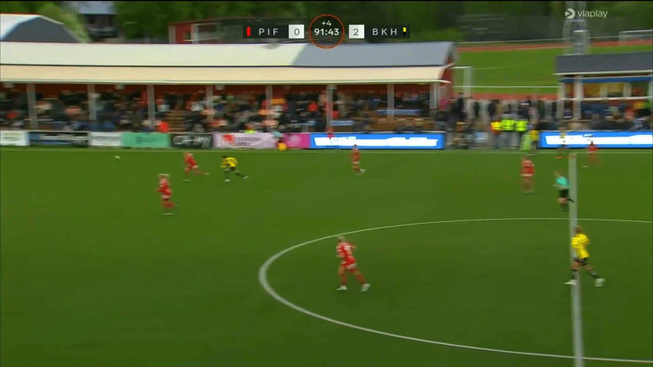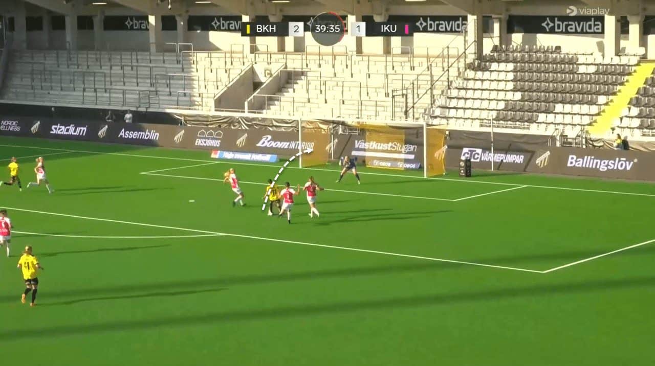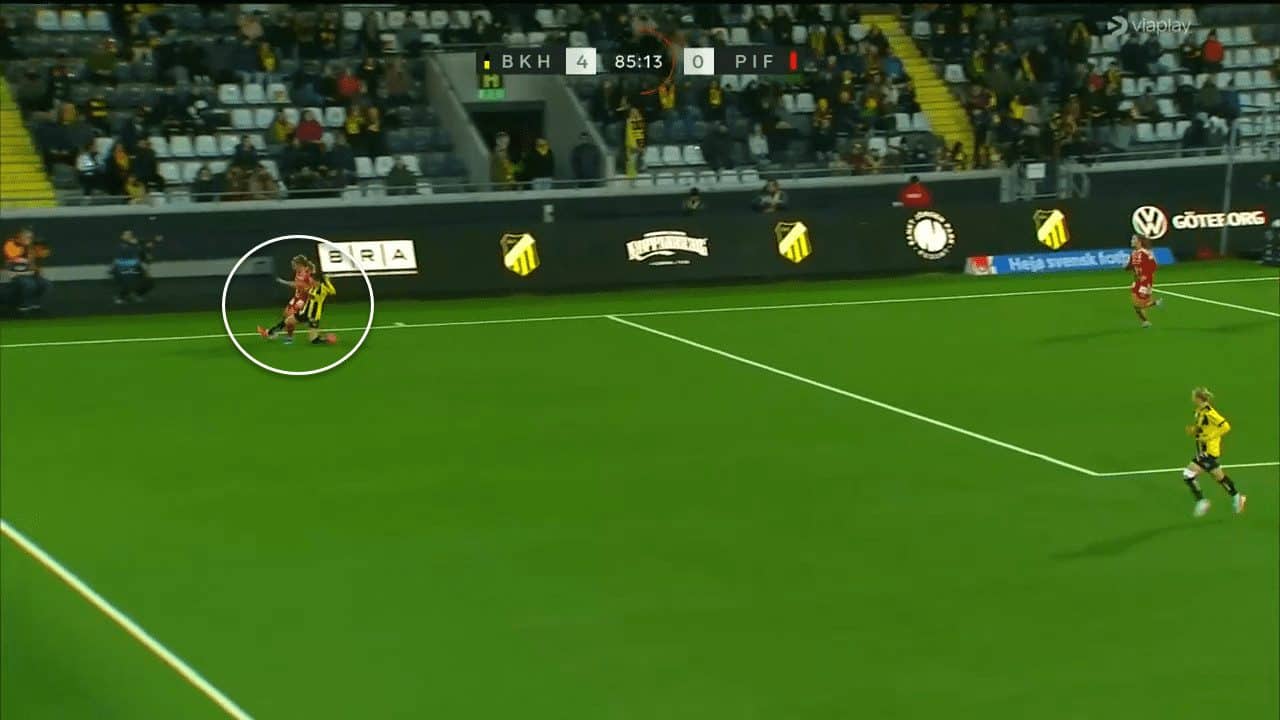 BK Häcken can use Larisey a bit more often in terms of passing in order to create space for players coming from behind and let Larisey provide them assists like she did in the following example. Being a dynamic player who moves a lot without the ball and retreats so often to receive the ball and provide passes represents a key weapon for the team as it confuses opposing defences regarding positioning and players to mark.