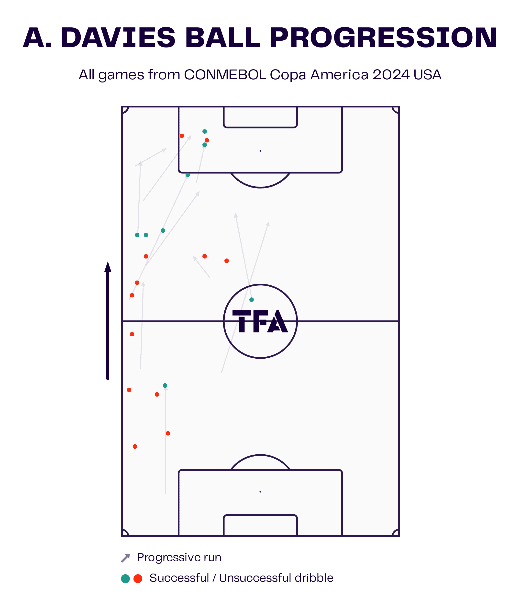 Notably, though, his dribble success was far higher in the final third than in deeper areas, with Davies conceding possession more often than he would’ve liked when trying to dribble out of his own half or even in the middle third of the pitch.