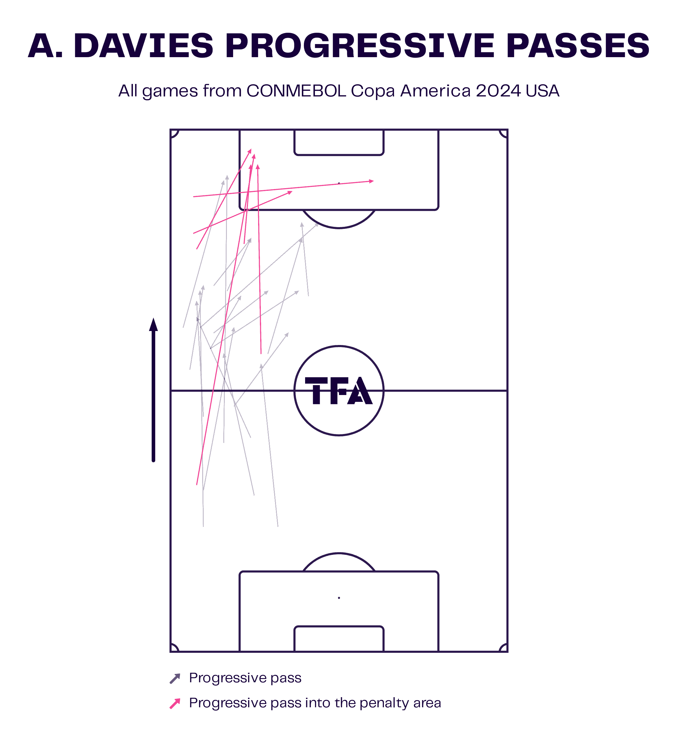 The 23-year-old completed 6.62 progressive passes per 90 in Copa América with an impressive 80% success rate. While Davies was heavily involved in various facets of his team’s possession play, he was a tournament standout in getting his team moving into the opposition’s penalty box, with Davies’ 2.87 passes into the penalty area a Copa América high for U23s.