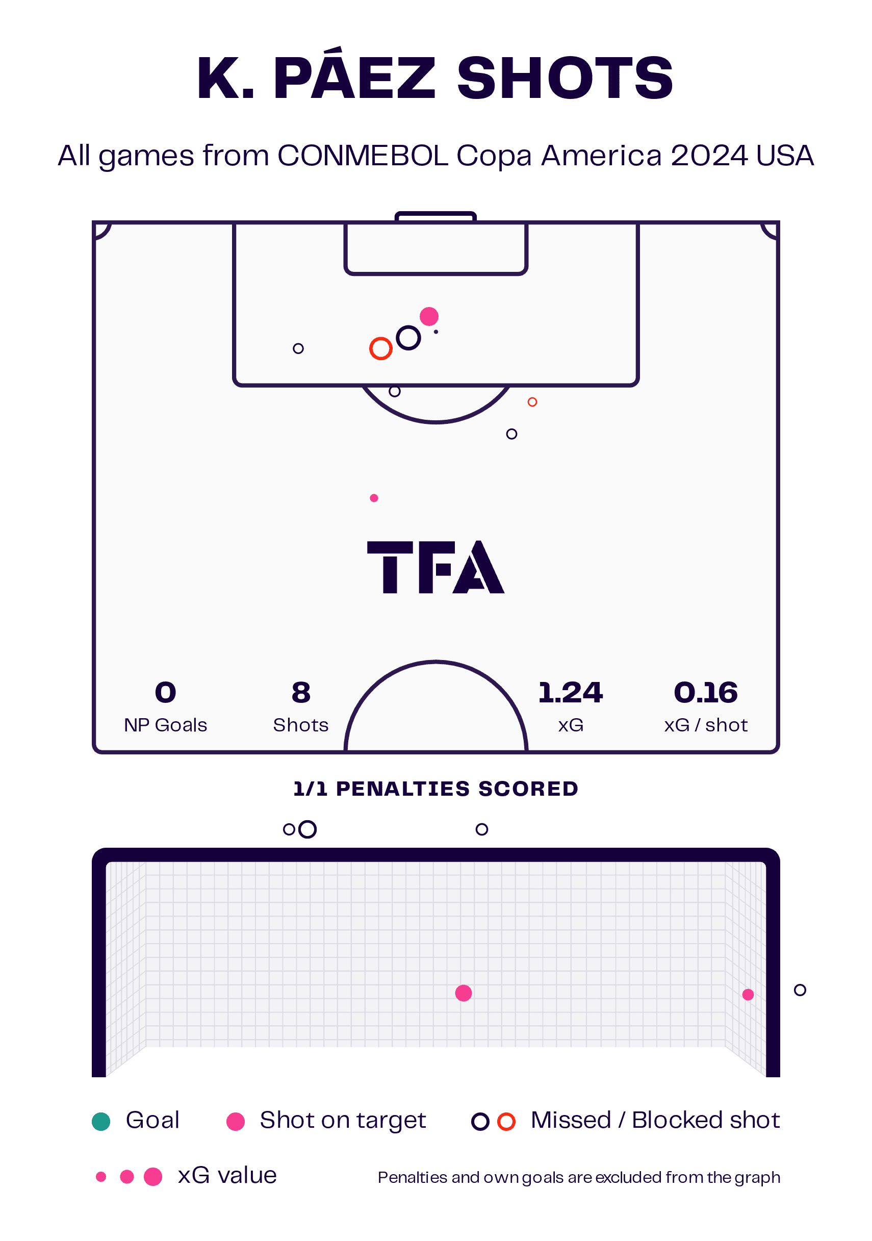 Scoring one penalty — not included on the graph or in the data displayed — Páez also took eight more shots during this tournament, generating an xG of 1.24. This averages out to 0.16 xG per shot — pretty impressive numbers indicative of intelligent shot selection and good positioning, which aren’t always the first attributes that spring to mind when dealing with young players but are a very good sign of the level of talent we’re talking about.
