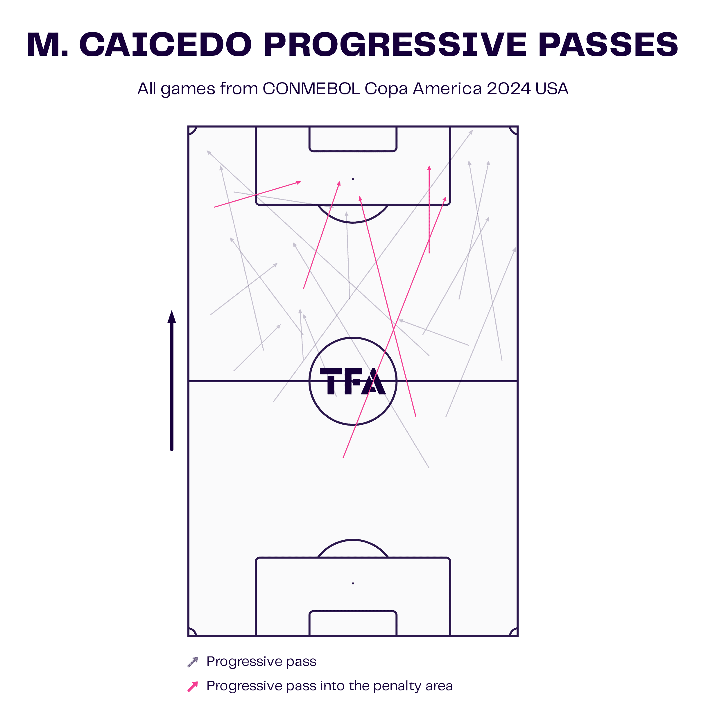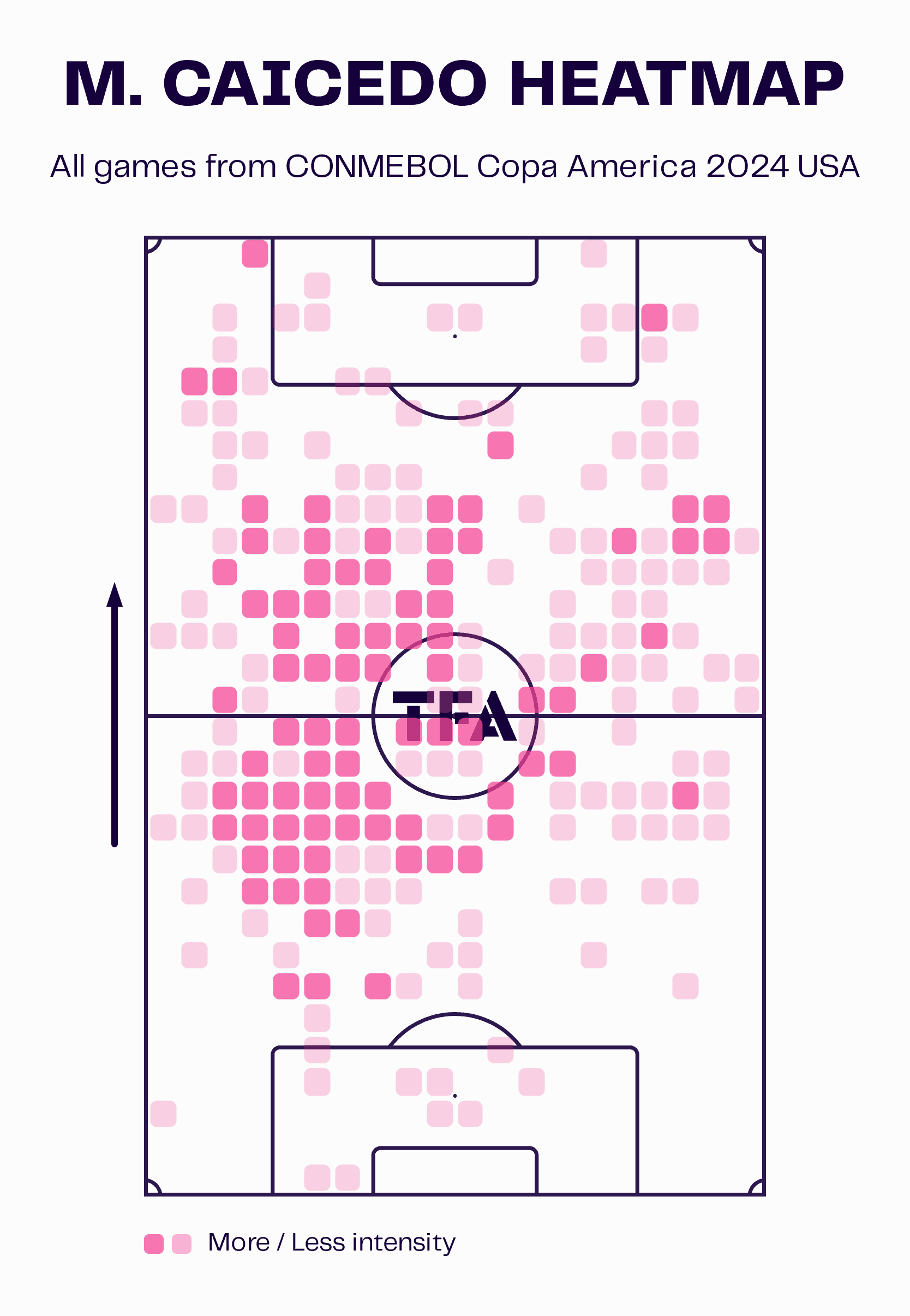 Caicedo emerged as a real leader on the pitch for La Tricolor during Copa América both on and off the ball. In possession, the 22-year-old exhibited the kind of bravery required of a deeper-lying midfielder while also progressing into more advanced areas of the midfield, at times, to act as more of a playmaker.
