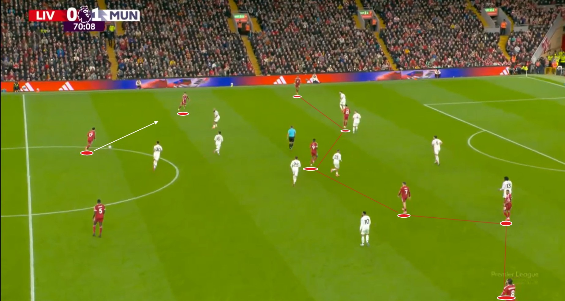 Jones receives on the half-turn and escapes tight areas, giving Liverpool vital breathing space.