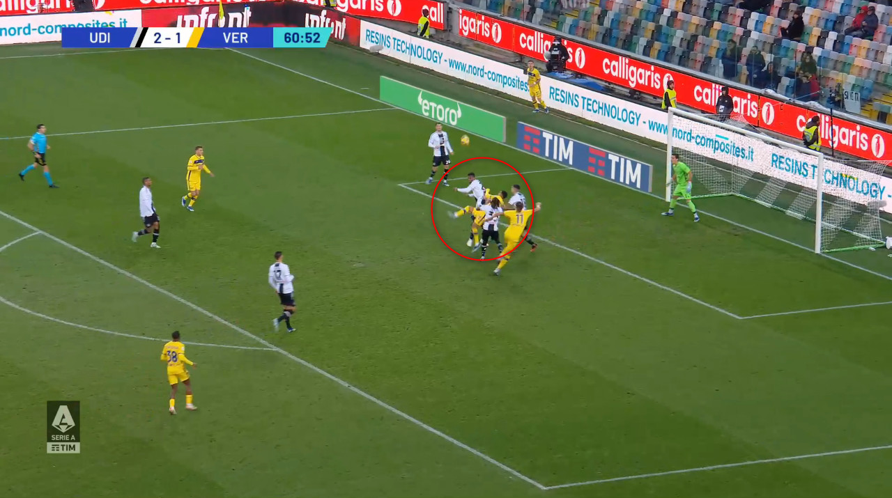 A perfect example of his abilities in the air is his bicycle kick goal against Udinese, which was outstanding and very telling regarding Ngonge’s goalscoring potential, despite the disturbance caused by four Udinese players.