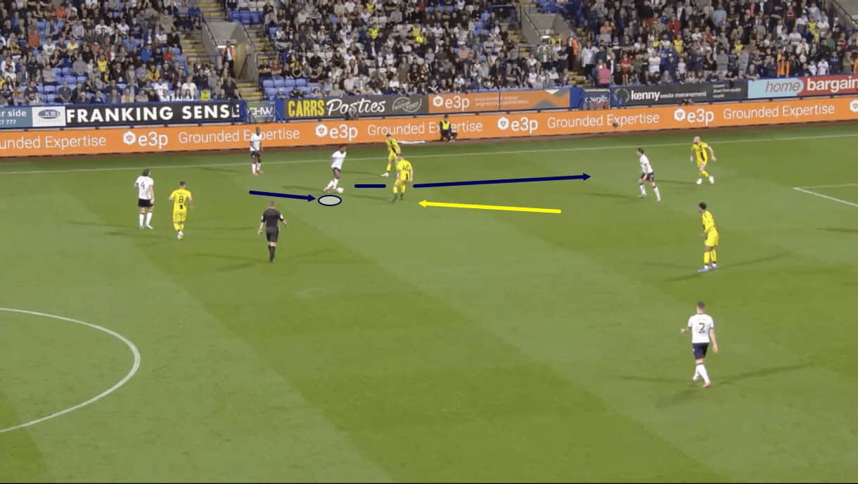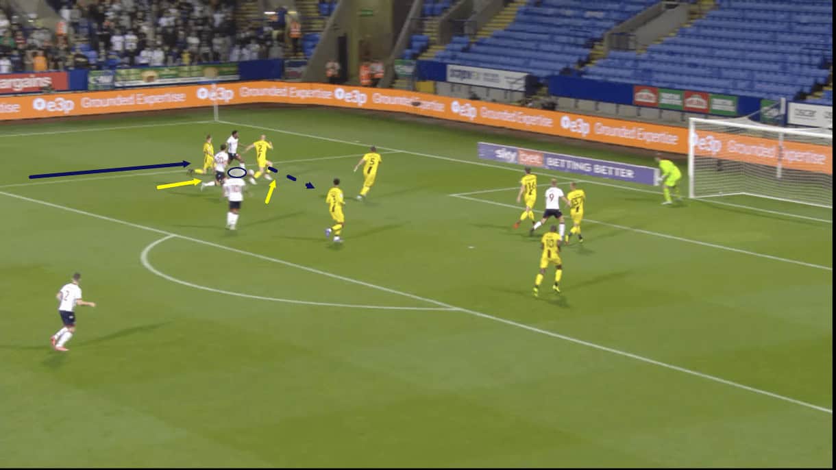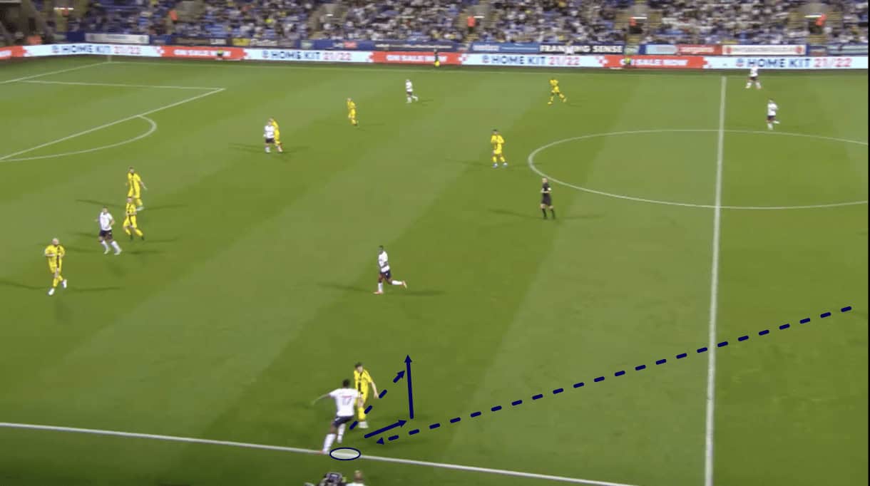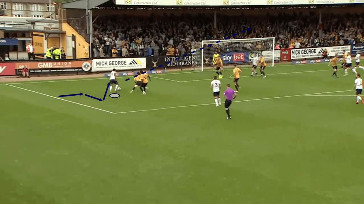 This image provides a clear example of Afolayan’s 1v1 ability. He’s intelligent to spot ways of getting past his man and wastes no time in exploiting them, reacting quickly as opportunities present themselves. Additionally, he’s pacey and well able to get away from his man after beating them, driving into space as we see here to push his team on.