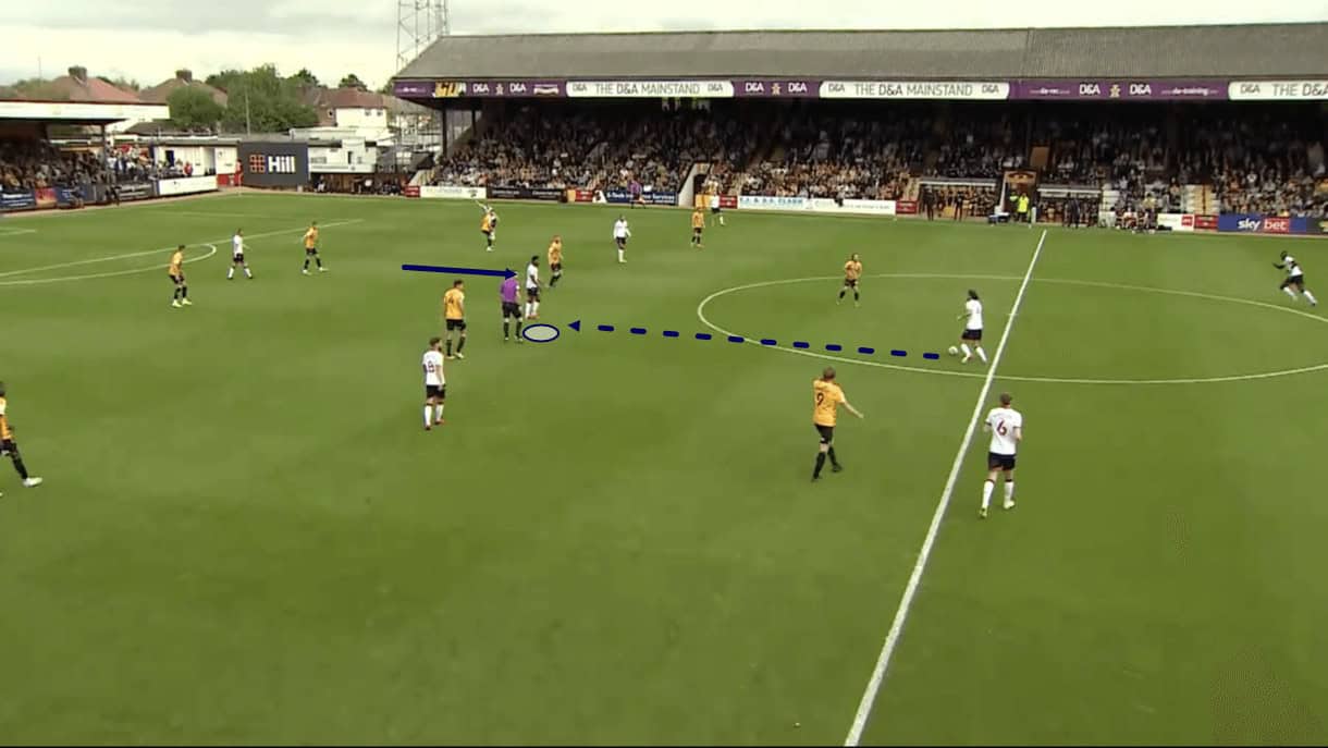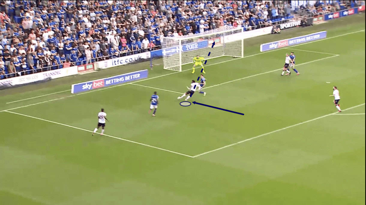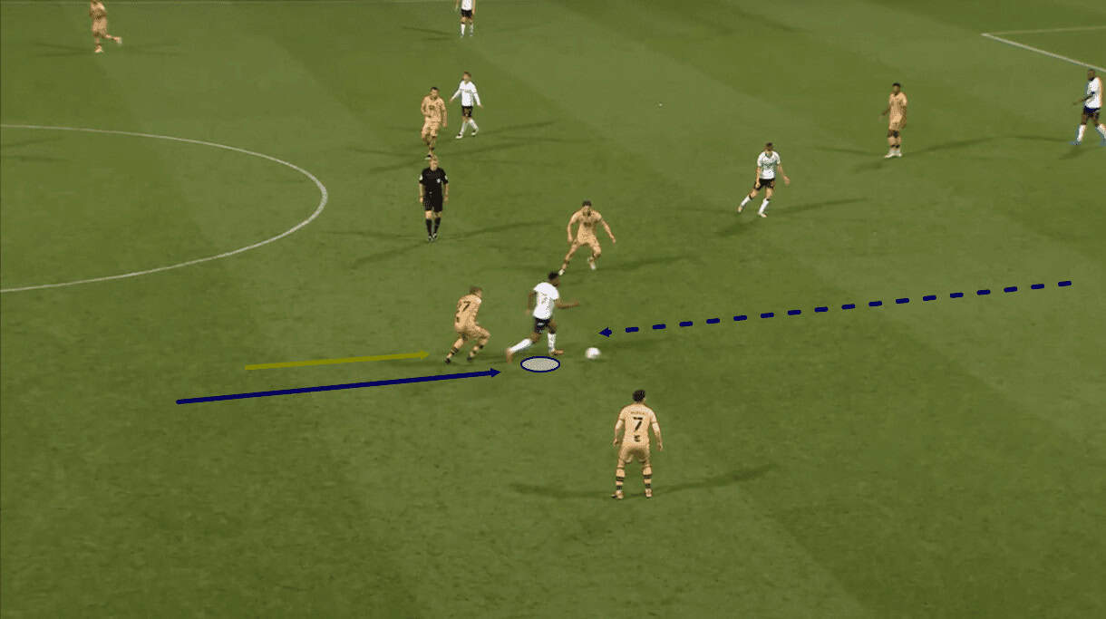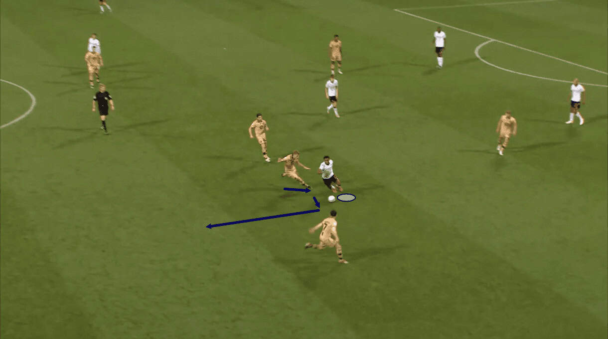 This passage of play highlights Afolayan’s threat as a ball-carrier. He’s great at using his technical quality and pace to drive past players in 1v1s, while his threat in 1v1 situations can also be enough to force defenders to back off and avoid engaging in 1v1s with him, which is better than being beaten but can still allow the attacker to progress into a threatening area, as was the case here.