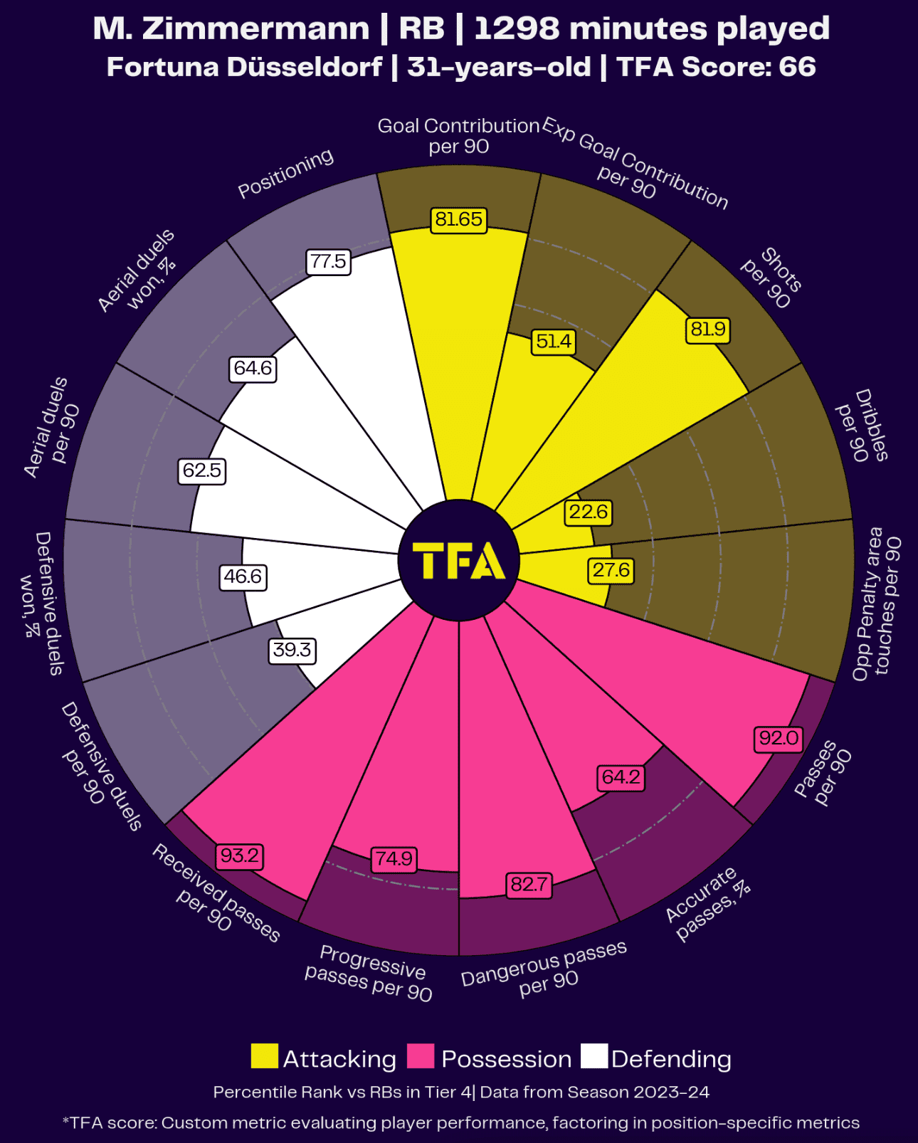 When we start to drill further down into his performance via his pizza chart, you can clearly see that he has a balanced profile across all three key areas of the game. In the attacking phase, he actually contributes effectively compared to other RBs in 2. Bundesliga, and he is in the 81st percentile for goal contributions and the 81st percentile for shots per 90. In possession, we have already seen from the scatter graph that he is progressive, but he also has good volume to his passes, and he is in the 92nd percentile for passes per 90, but as you can see, he is also in the 82nd percentile for dangerous passes and the 74th percentile for progressive passes. He has also been impressive for a right-back so far this season in the defensive phase, and he is in the 62nd percentile for aerial duels and the 64th percentile for the % of aerial duels he has won. He is also in the 77th percentile for positioning.