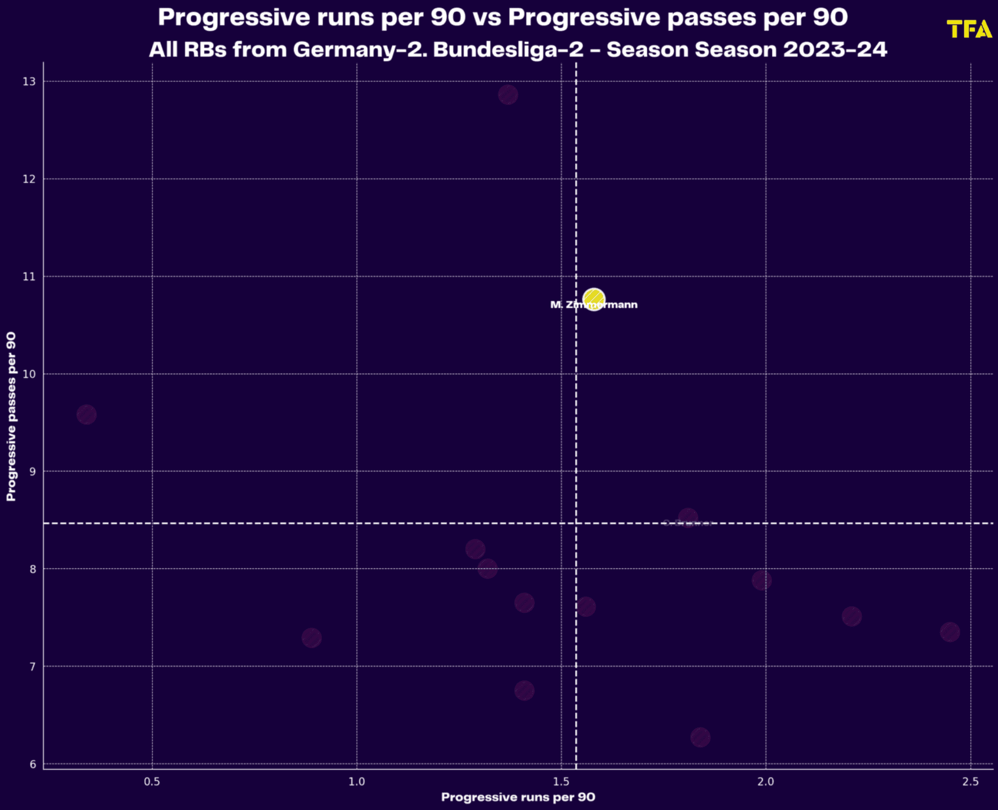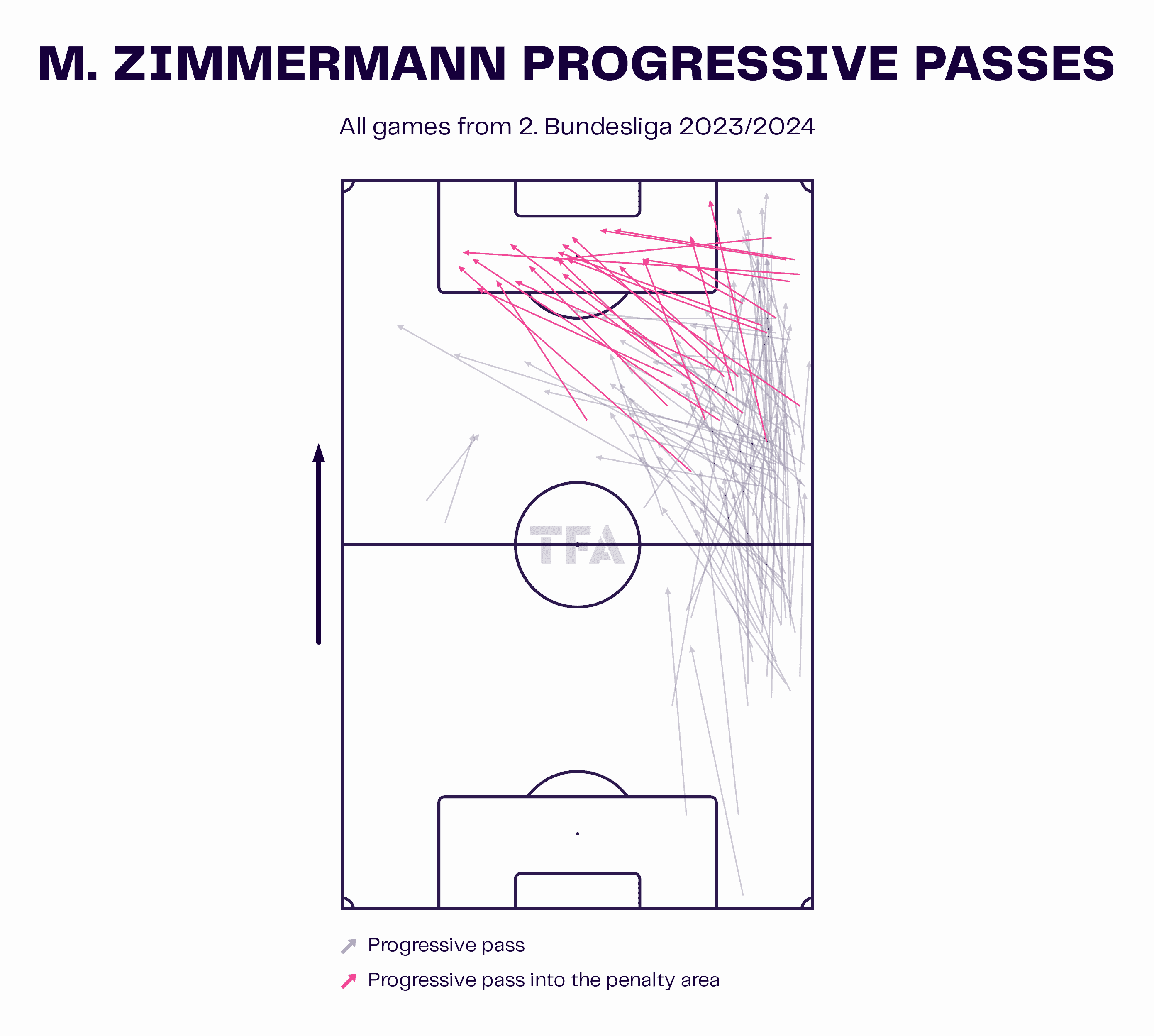 When we look at the map of progressive passes for Zimmerman so far this season in 2. Bundesliga, you can see that he is effective from the wide areas in terms of moving the ball forward for teammates into the final third. Interestingly, when he is in the final third, he creates a threat from the half-spaces when progressing the ball and playing into the opposition penalty area.