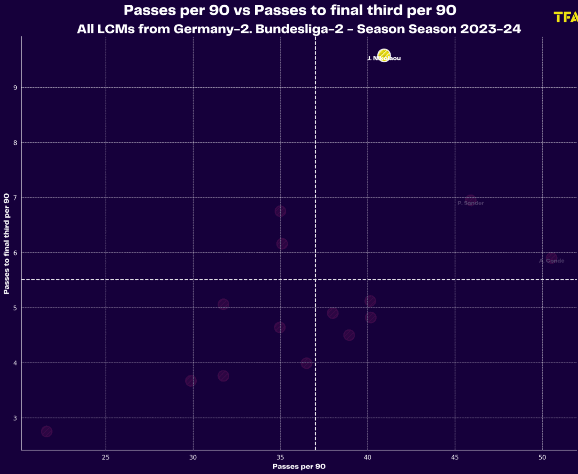 The final player that has been selected for the article today is another that might be considered to be towards the end of his career at 30 years old, but he is also a midfield player who is currently playing at a high standard in terms of his passing and ball progression from the centre of the pitch. He is currently the captain of Eintracht Braunschweig, having been at the club since 2020. He had previously played for Koln and Dynamo Dresden, but the majority of his career has been in the second tier of Germany. He is a defensive midfielder of 6 who is extremely capable when it comes to progressing the ball through lines. The scatter graph above shows passes per 90 along the x-axis and passes to the final third up the y-axis, and once again, we can clearly see that he has good volume to his passes and is a progressive player in possession.