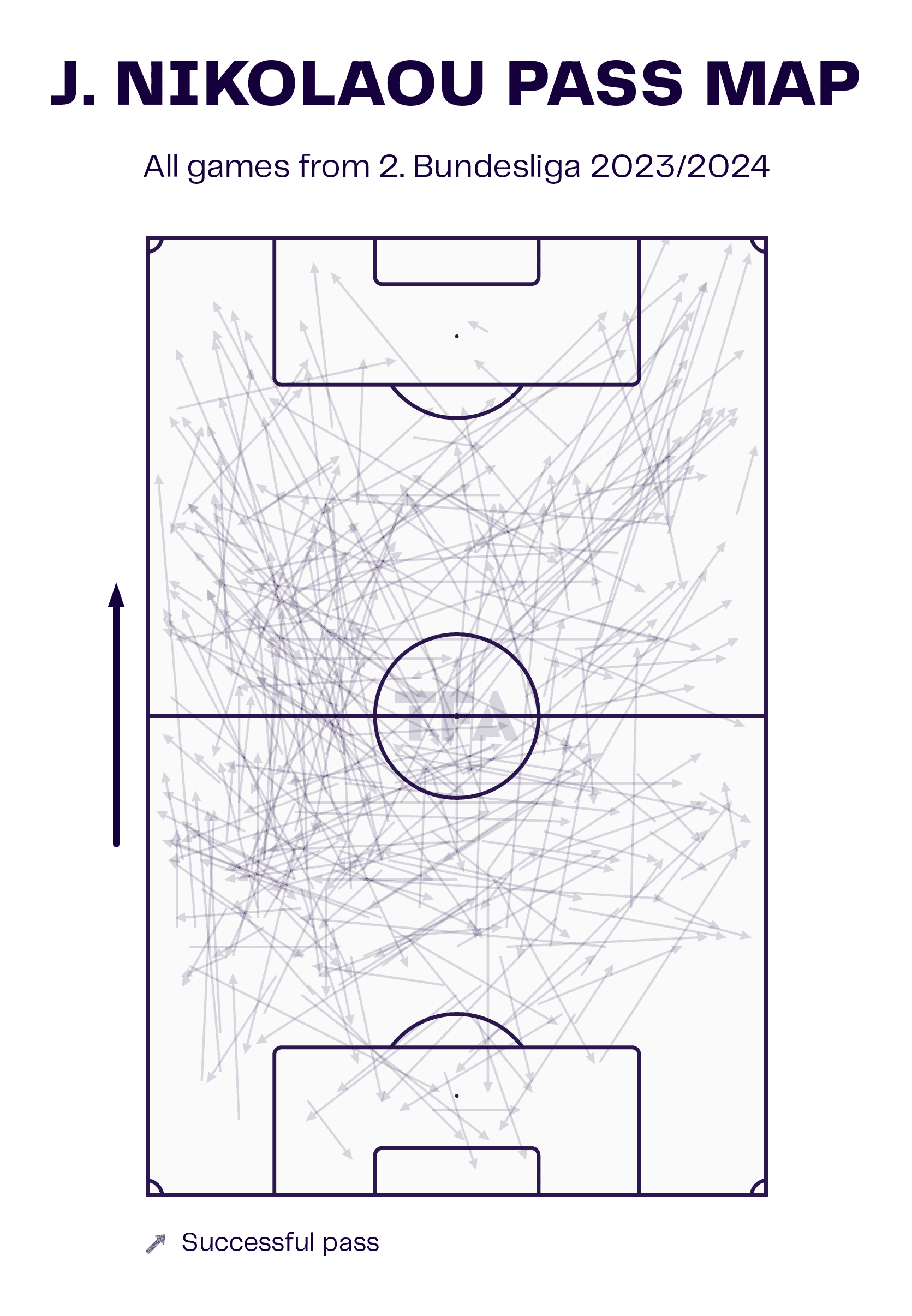 As you can see from the pass map for Nikolaou this season, he tends to play for the most part from the left side of the pitch, with his passing typically going into the half-spaces on the left side.